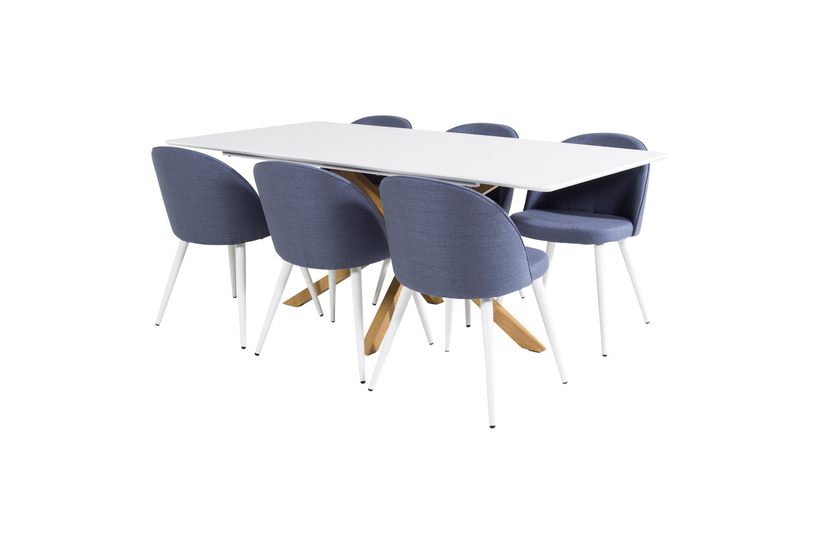 Velvet & Piazza Spisestole 2-pak Blå + Rektangulært Spisebord 180 x 90 Hvid