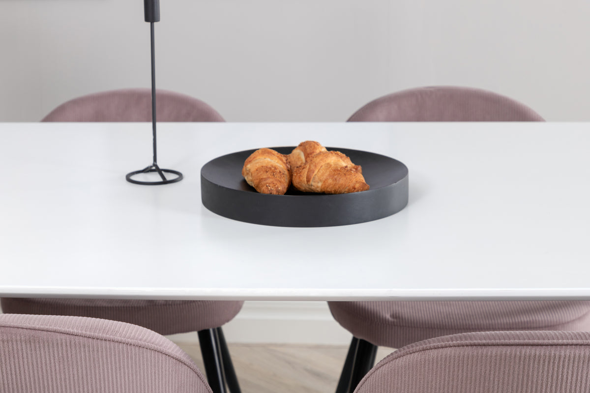 Spisebord Polar med hvid bordplade og sorte ben sammen med pompøse rosa Velvet velourstole forhøjer indtrykket i ethvert spisestuerum. Elegant og hyggeligt!