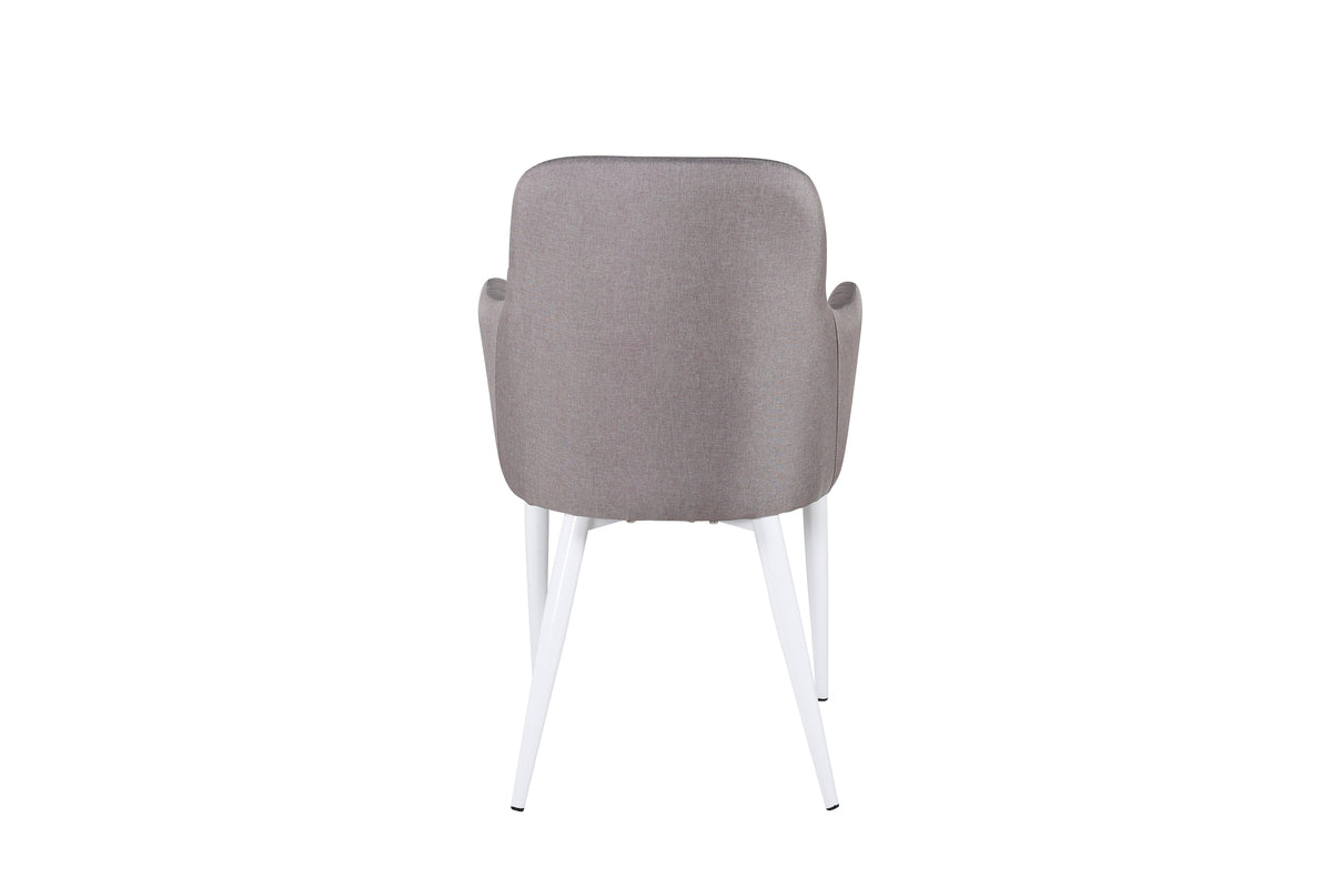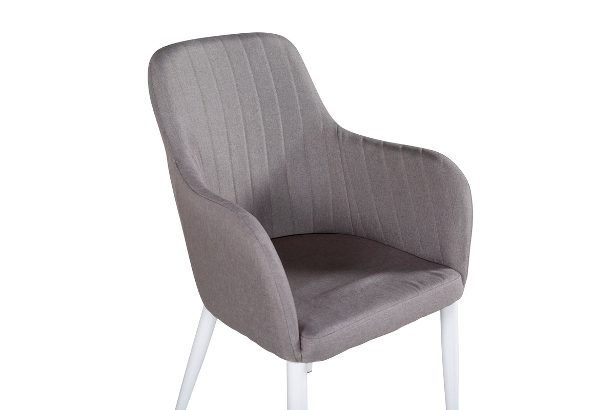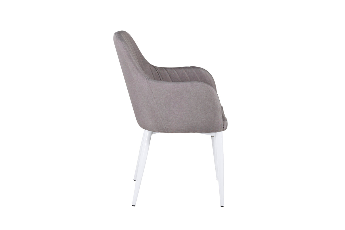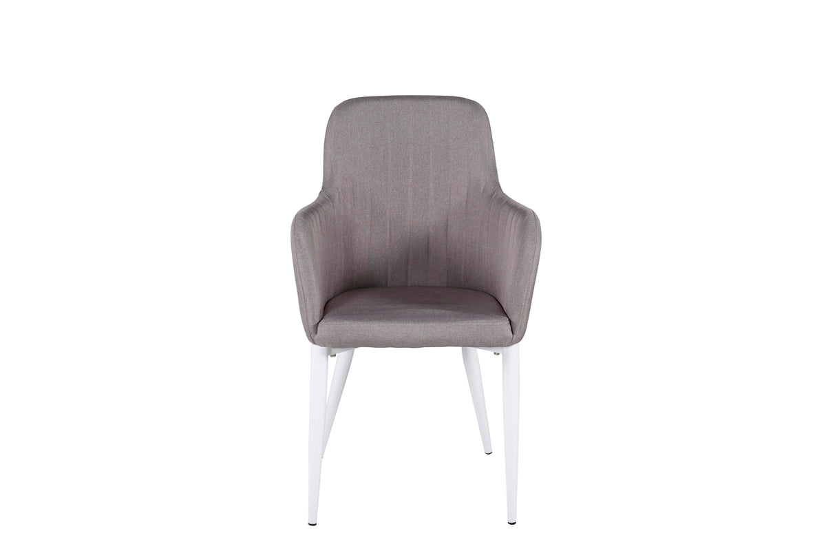 Sid behageligt og forhøj den hyggelige stemning omkring spisebordet med en afslappende spisebordsstol fra serien Comfort! Den har et cool, fuldpolstret design med ben i hvidt pulverlakeret metal og ryg og sæde med integrerede armlæn i gråt polyesterstof med skøn siddekomfort. Dekorative syninger på indersiden af ryg og armlæn giver en stilfuld detalje. Lettere montering kræves.