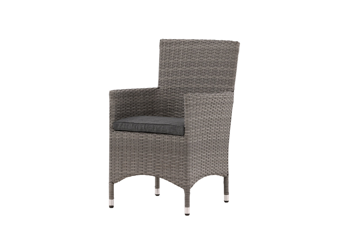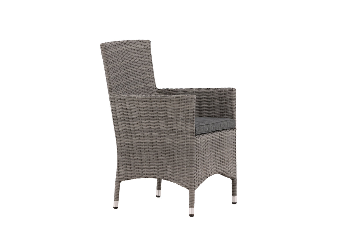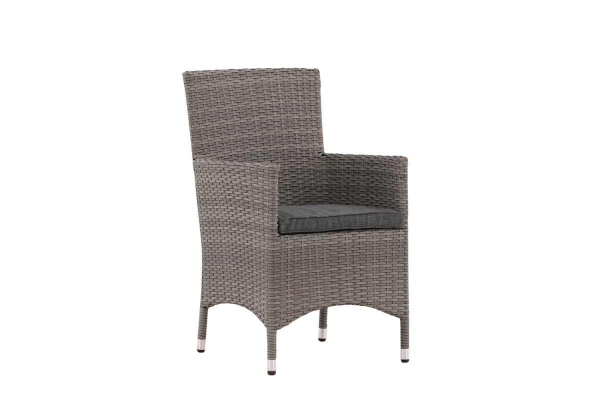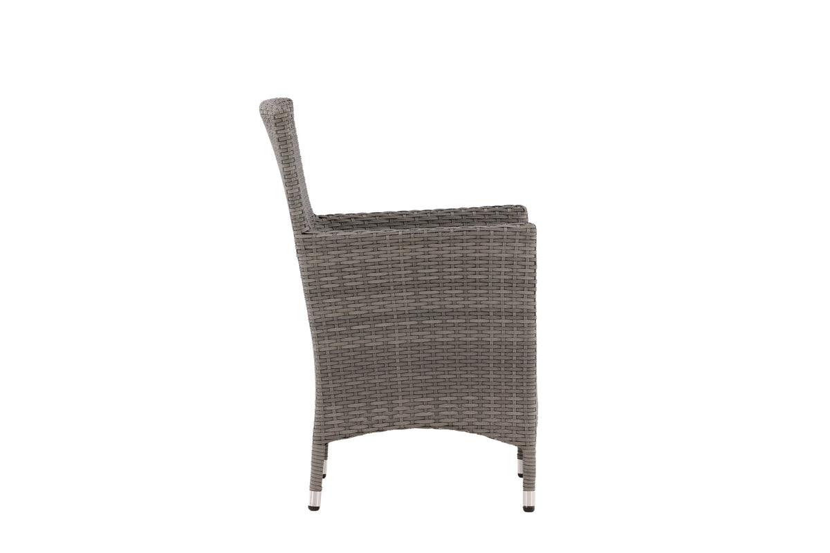 Moderne, stilren og slidstærk - hvad mere kan man ønske sig? I denne grå armstol fra serien Malin kan du nyde mange middage sammen med dine nære og kære i løbet af sommeren. Med en ramme i aluminium og kunstrådd får du en robust stol, der holder over tid. Sid behageligt i sommer og nyd dejlige måltider udendørs! Stolen er stabelbar.