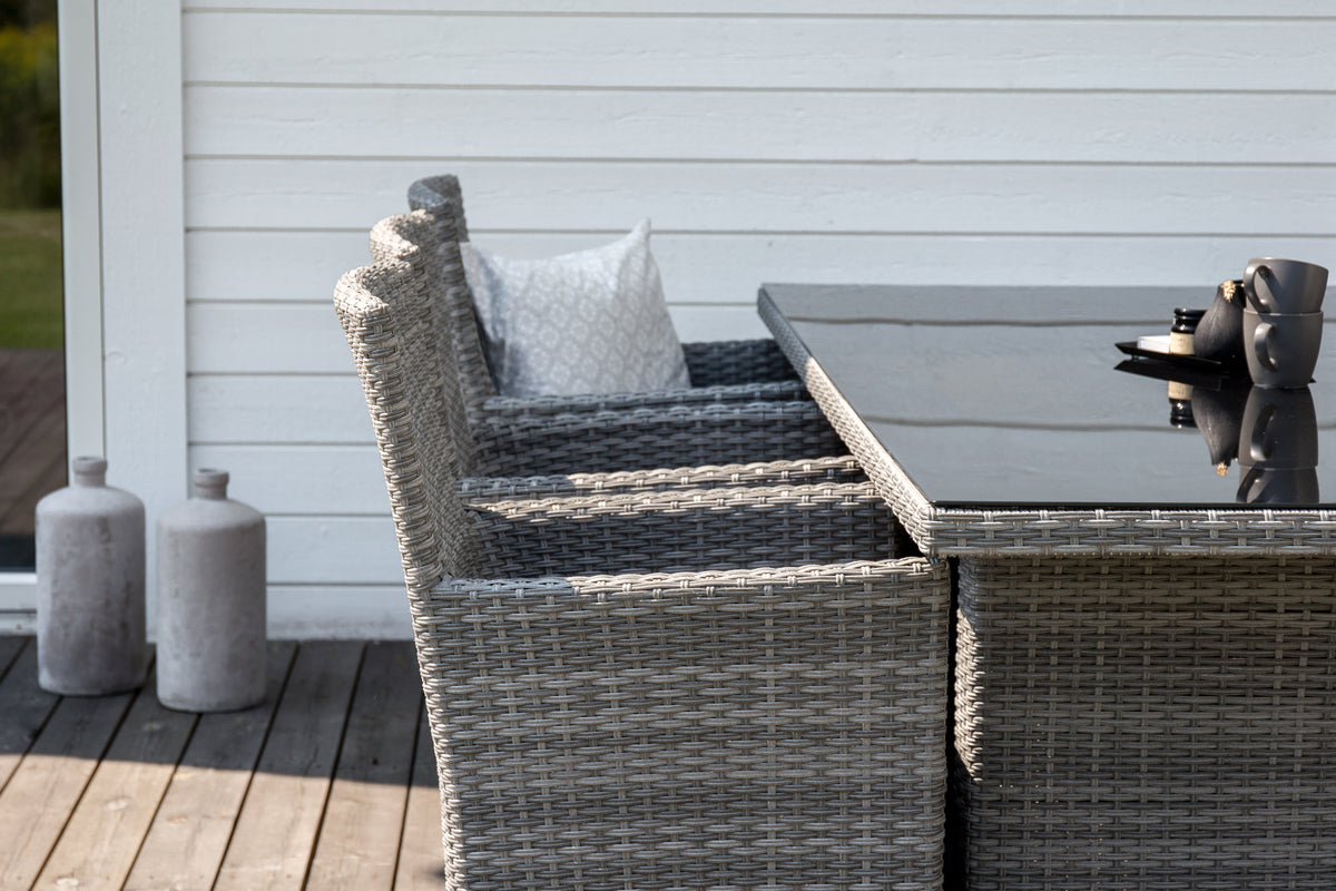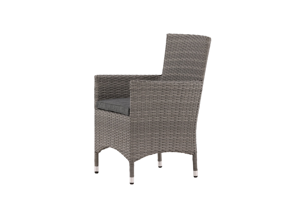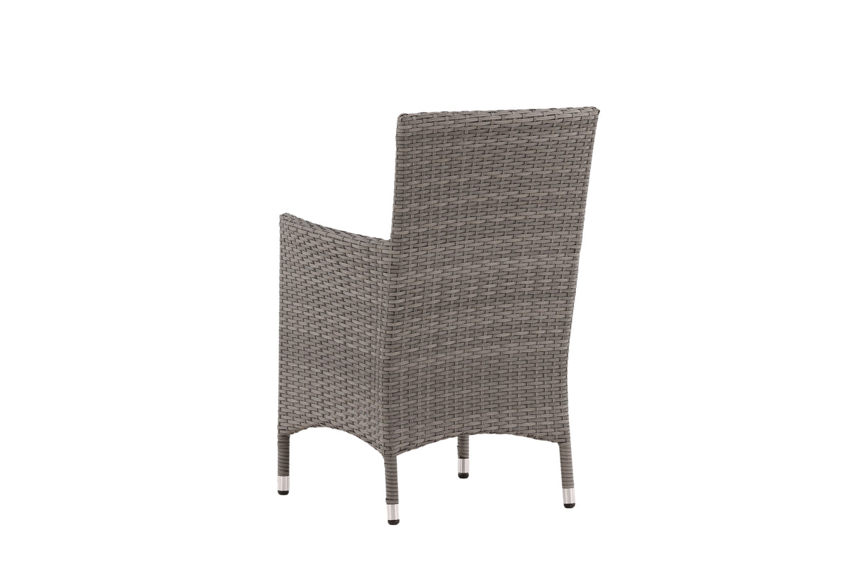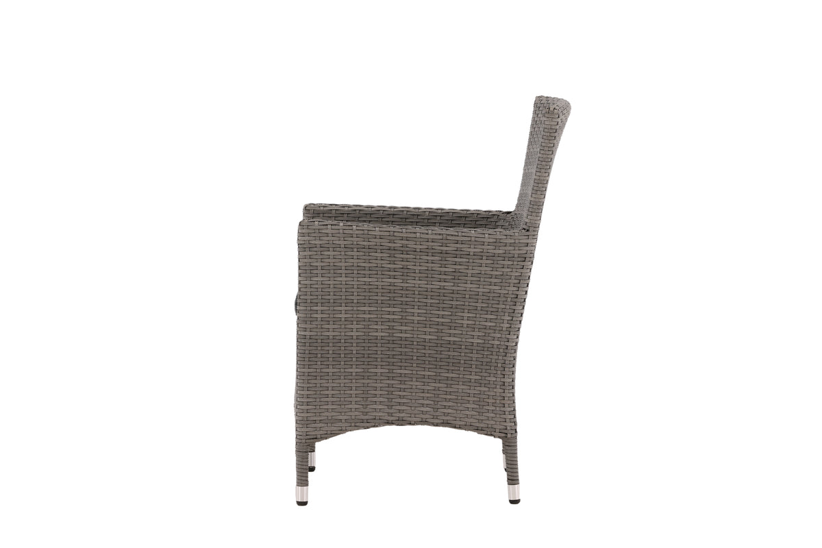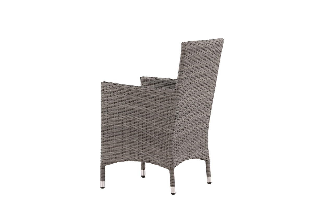 Moderne, stilren og slidstærk - hvad mere kan man ønske sig? I denne grå armstol fra serien Malin kan du nyde mange middage sammen med dine nære og kære i løbet af sommeren. Med en ramme i aluminium og kunstrådd får du en robust stol, der holder over tid. Sid behageligt i sommer og nyd dejlige måltider udendørs! Stolen er stabelbar.
