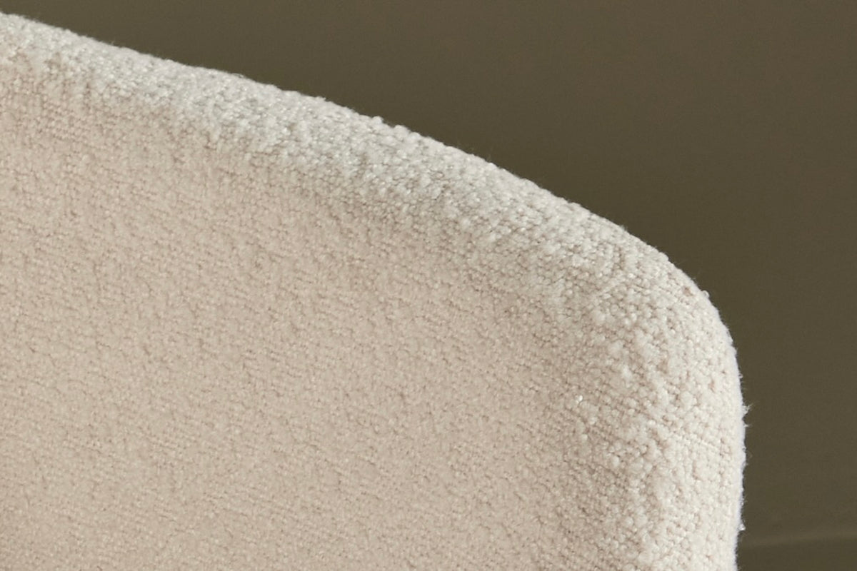 Kristin er en elegant spisebordsstol med afrundede former og et moderne udtryk. Den hvide bouclé giver stolen en luksuriøs, indbydende følelse, som gør hvert måltid lidt mere specielt.
