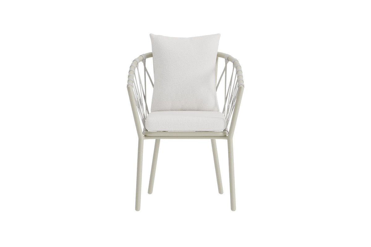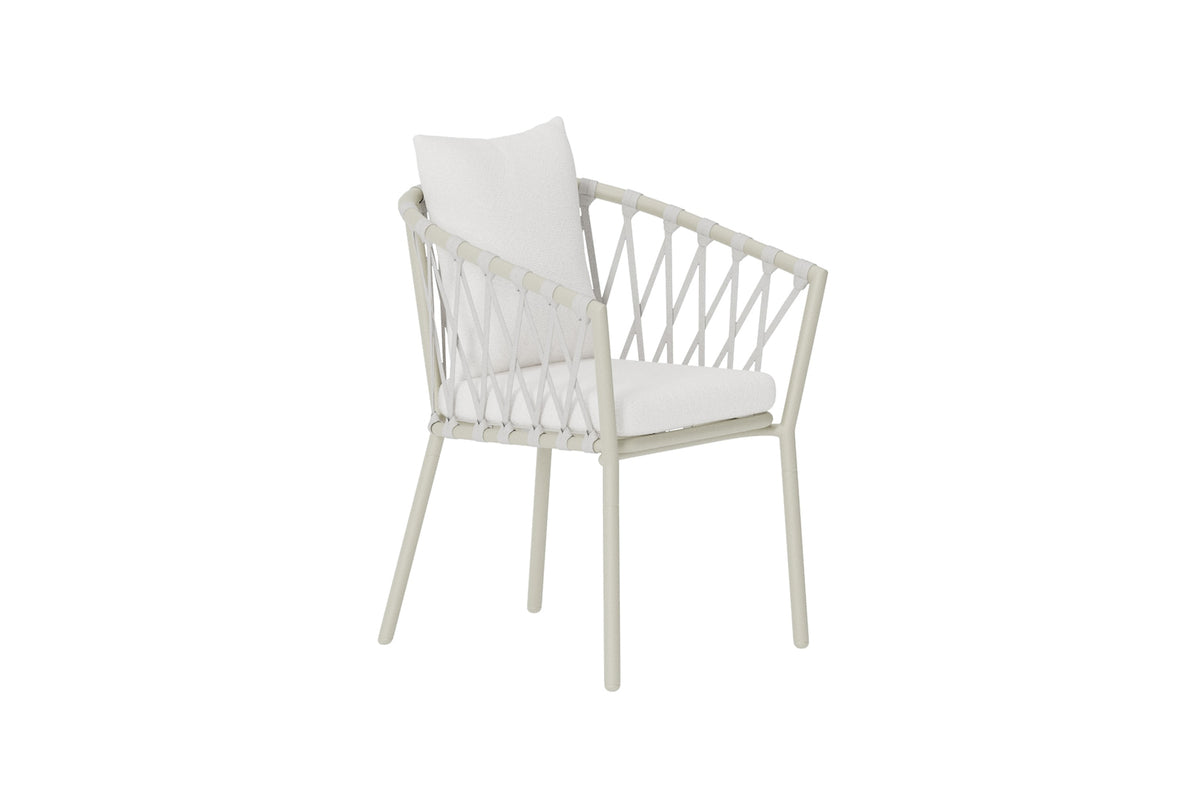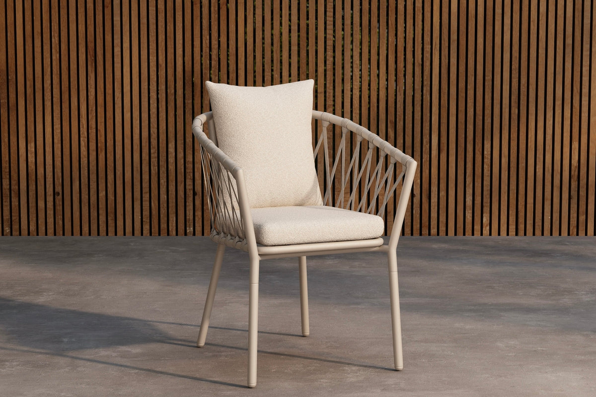 Linos spisebordsstol er en elegant stol i beige med bløde hvide hynder betrukket med trendy bouclé. Den flettede ramme giver et stilfuldt og luftigt udtryk, mens de generøse hynder gør stolen ekstra behagelig at sidde i – perfekt til lange middage og dejlige stunder rundt om bordet. Kombinationen af den varme ramme og de lyse tekstiler skaber en moderne, men tidløs følelse, der løfter enhver spiseplads. Linos er stolen til dig, der vil forene komfort med sofistikeret design.