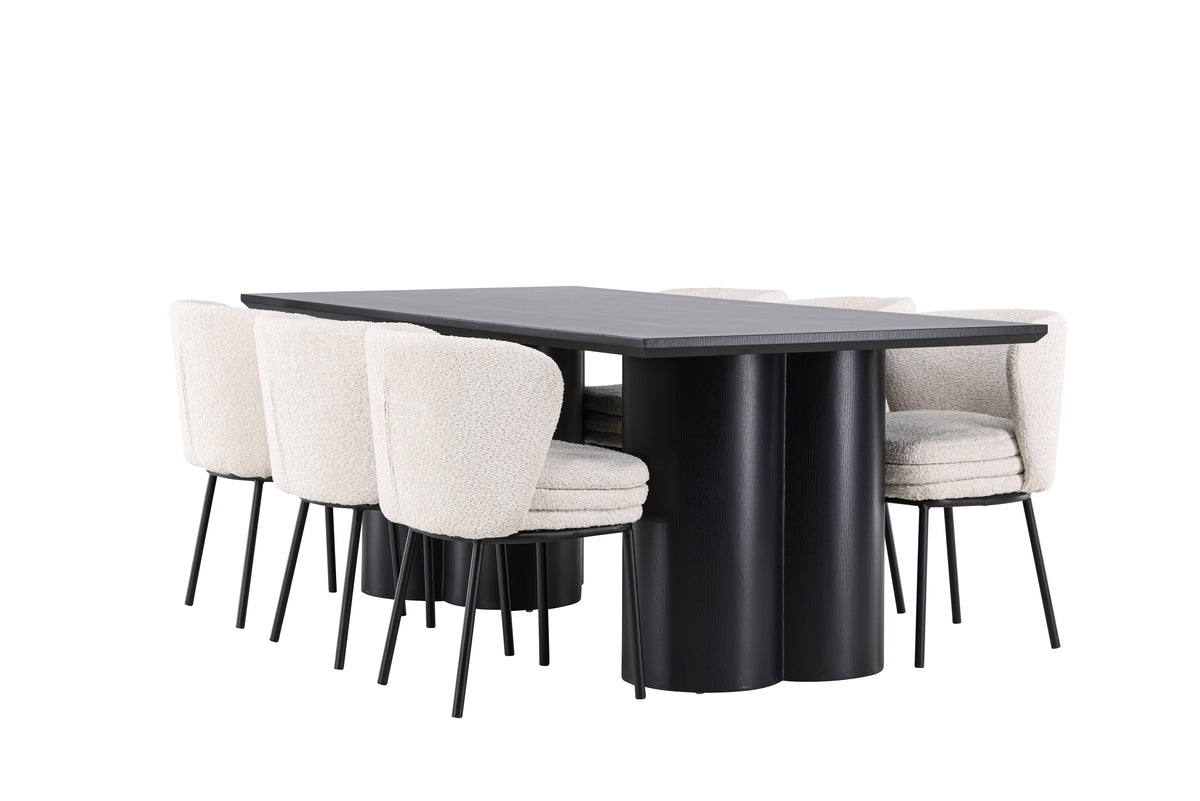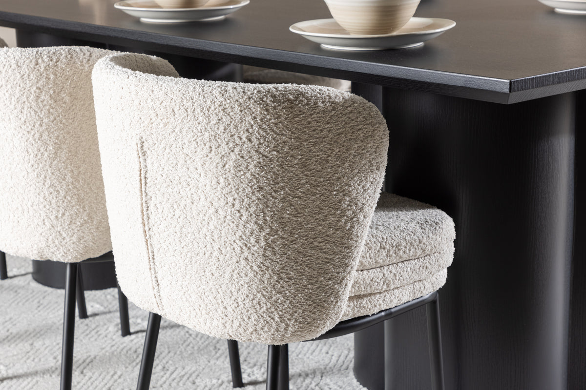 Opdag den perfekte spisegruppe med Agnes spisebordsstol og Olivia spisebordet - en kombination, der udstråler både elegance og modernitet til dit hjem. Agnes spisebordsstol tilbyder en enkel skønhed og stilrent design med sit sæde i hvid bouclé og elegante sorte stålben. Det bløde og teksturerede sæde giver en varm og indbydende følelse, mens de sorte stålben tilfører et moderne touch.