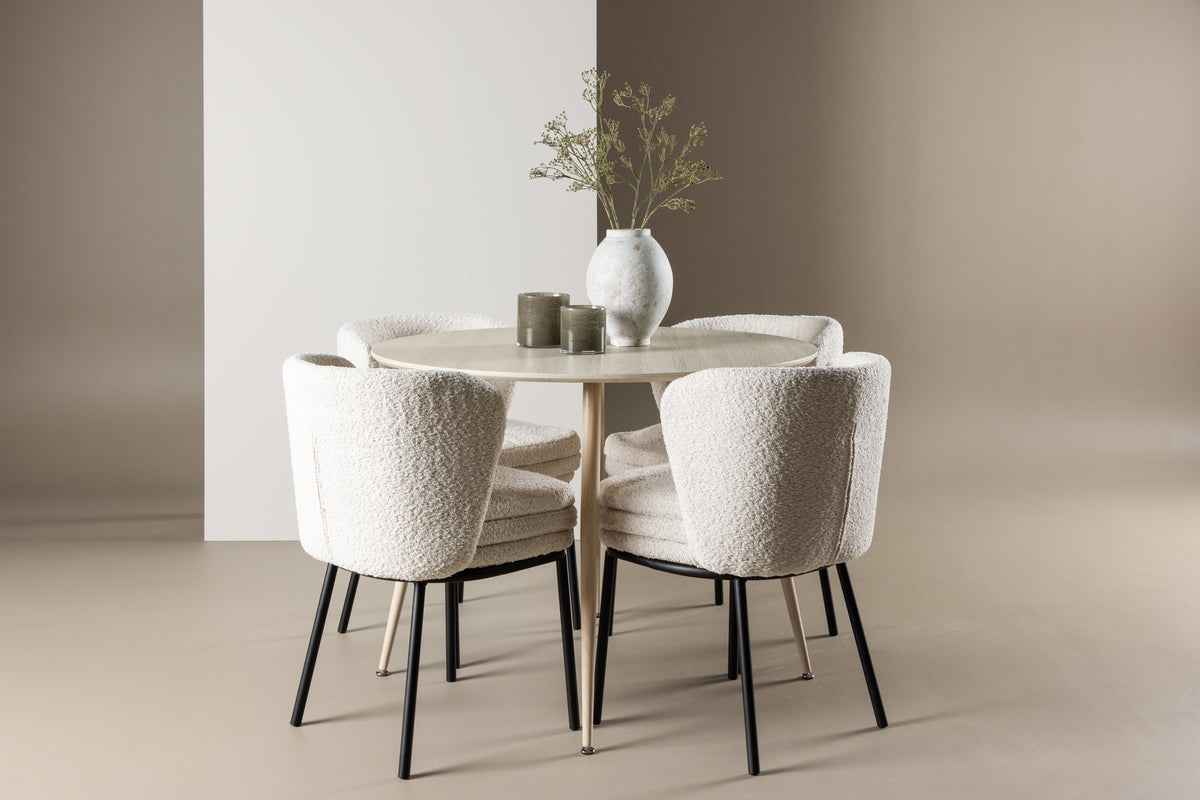 Kompletér dit spisebord med Agnes spisebordsstole, som tilbyder enkel skønhed og stilrent design. Med et sæde i hvid bouclé og elegante sorte stålben, giver Agnes en moderne og sofistikeret æstetik, der komplementerer alle indretningsstile. Det bløde og teksturerede sæde i bouclé giver en varm og indbydende følelse, mens de sorte stålben tilfører et moderne touch. Agnes spisebordsstole skaber en harmonisk atmosfære og giver dit spisestue eller køkken en imponerende visuel effekt.