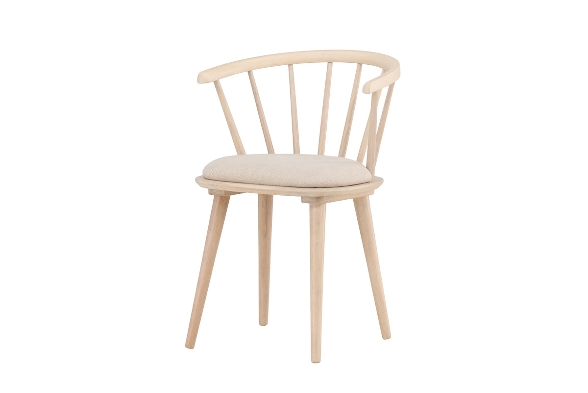 Den fastsyede beige hynde giver ekstra komfort og en blød kontrast mod det lyse træ. Bobby sælges i en praktisk 2-pak, perfekt til nemt at opgradere spisepladsen med stil og funktion.