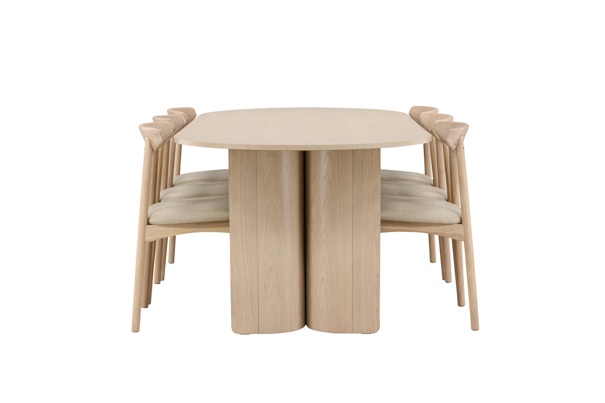 Det rene, skandinaviske design kombineres med Ven-stolenes bløde former og bekvemme sæder, hvilket giver en afbalanceret helhed af funktion og æstetik. Den lyse træoverflade spreder varme og naturlig harmoni i rummet og gør spisebordssættet til et tidløst midtpunkt i hjemmet.
