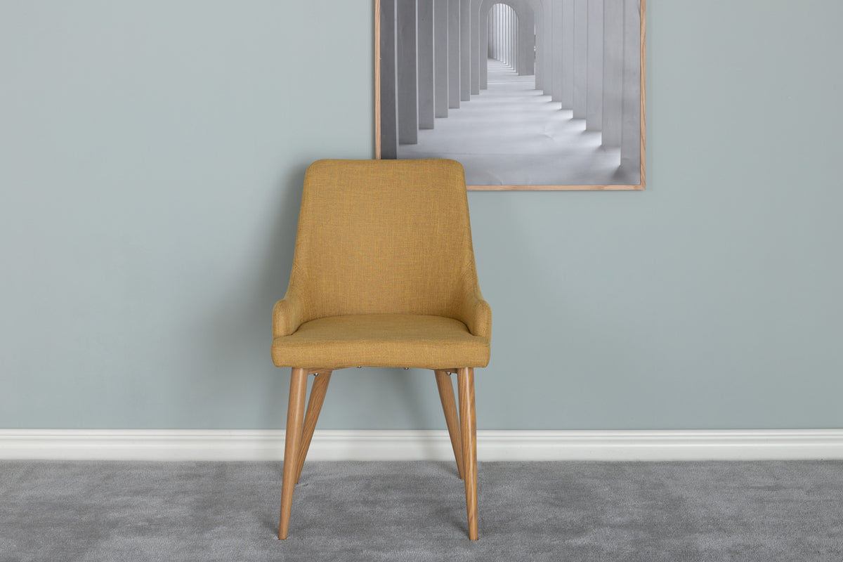 Denne spisebordsstol fra Plaza-serien giver dig både komfort, stilfuldt design og et farvepift, der liver hverdagen op! Spisebordsstolen har et fuldpolstret design med ben i egefolieret metal og ryg/sæde i sennepsgult polyesterstof med blød polstring for ekstra komfort. Lettere montering kræves.