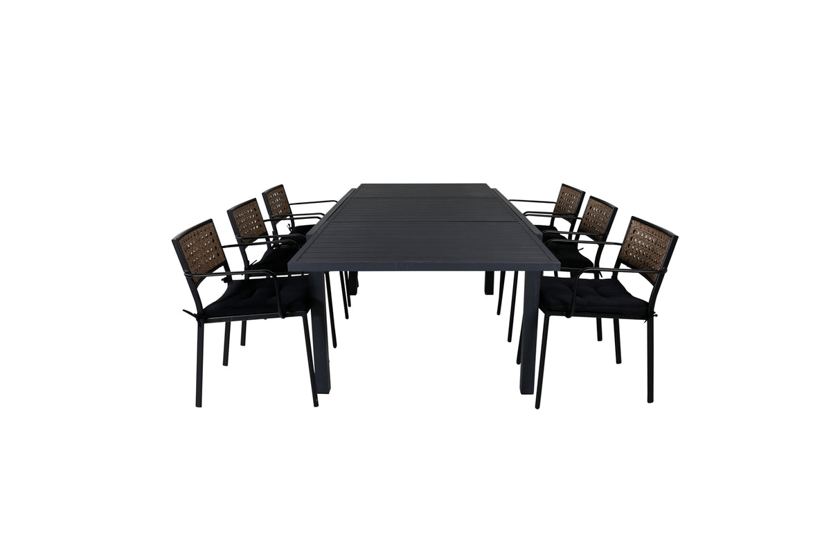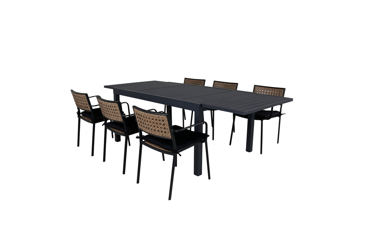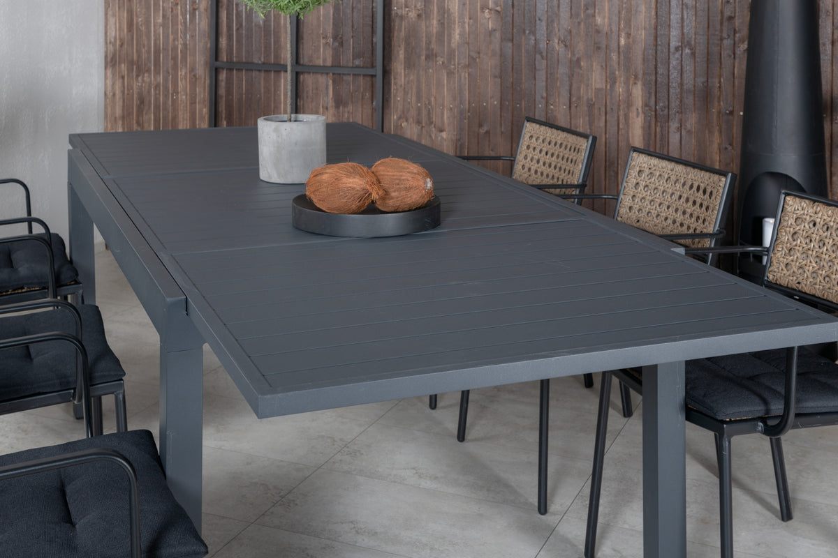 Marbella spisebord, flot og moderne – her sammen med stilrene spisebordsstole i serien Paola. Skab noget flot og socialt i udestuen med plads til god mad og dejligt samvær! Bordet er forlængeligt.