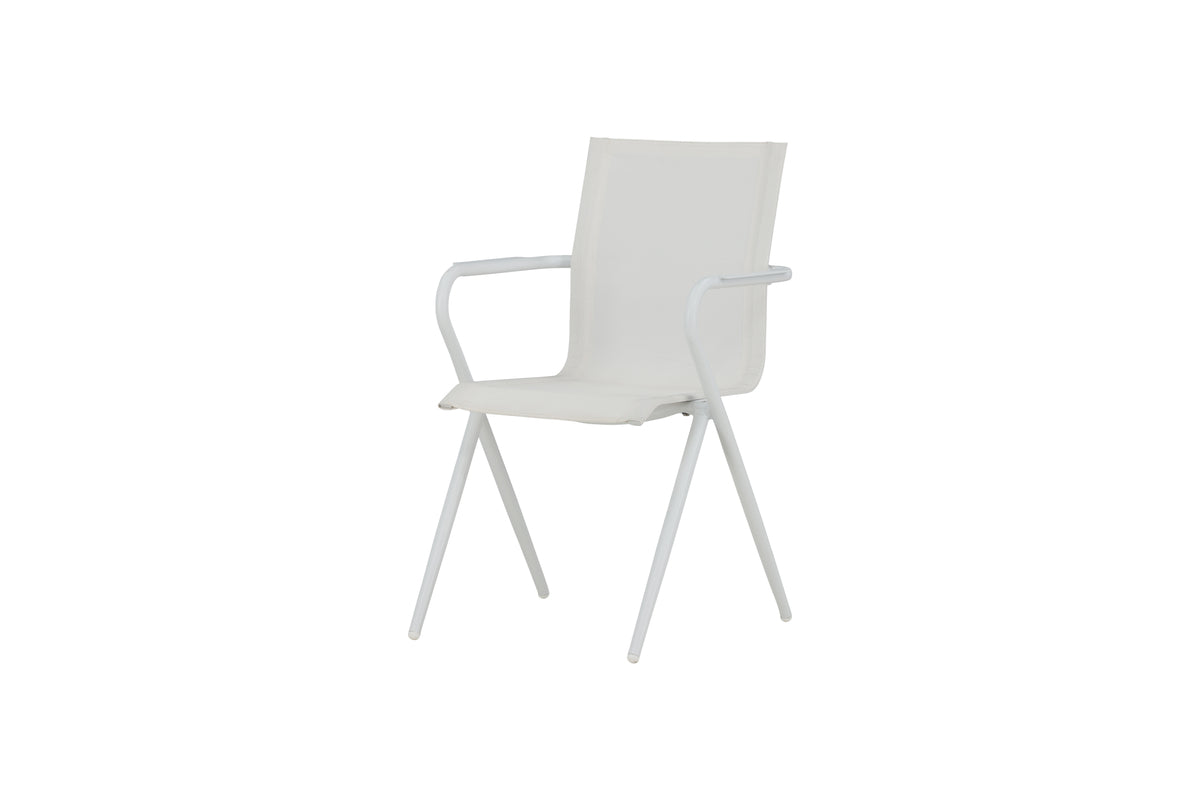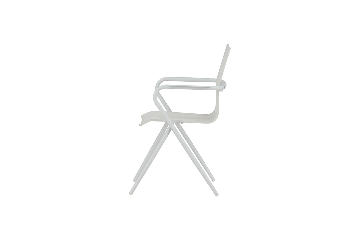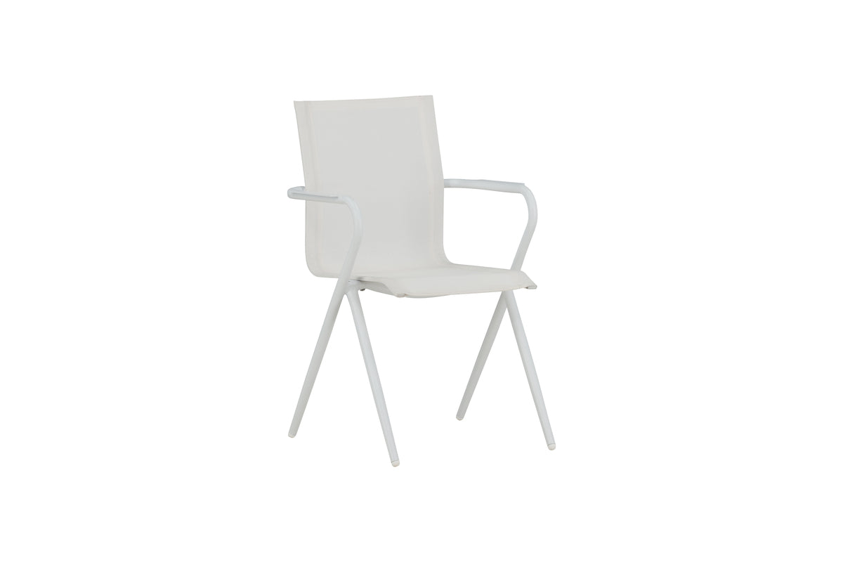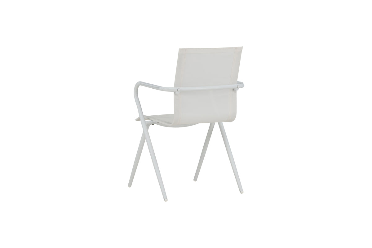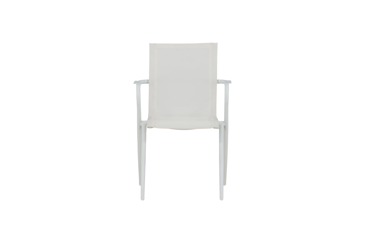 Alina, en hvid smagfuld spisebordsstol, der passer udmærket til udestuen såvel som terrassen. Gennem sin enkelhed gør den sig godt i alle miljøer og stilarter. Designet er moderigtigt med moderne udsvungne ben og armlæn for bekvemmelighed. Nyd sommerens måltider! Stolen er stabelbar.