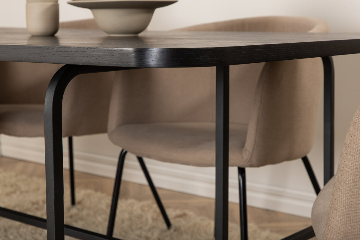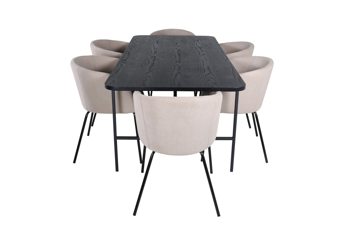 Vores populære spisebord Uno er lige så stilsikkert som tidløst! er rektangulært udformet med let afrundede hjørner, en bordplade i sort MDF med finer samt stilrent understel i sort metal. Bordets mål: Længde: 200cm, Bredde: 90cm, Højde: 74cm. Her i perfekt kombination med 6 stk. Berit spisebordsstole i beige polyester linned og stilrent smalle stoleben i sort jern. Stolens mål: Højde: 78cm, Siddehøjde: 49cm, Bredde: 55cm, Dybde: 55cm. En spisegruppe med fokus på komfort og elegance!