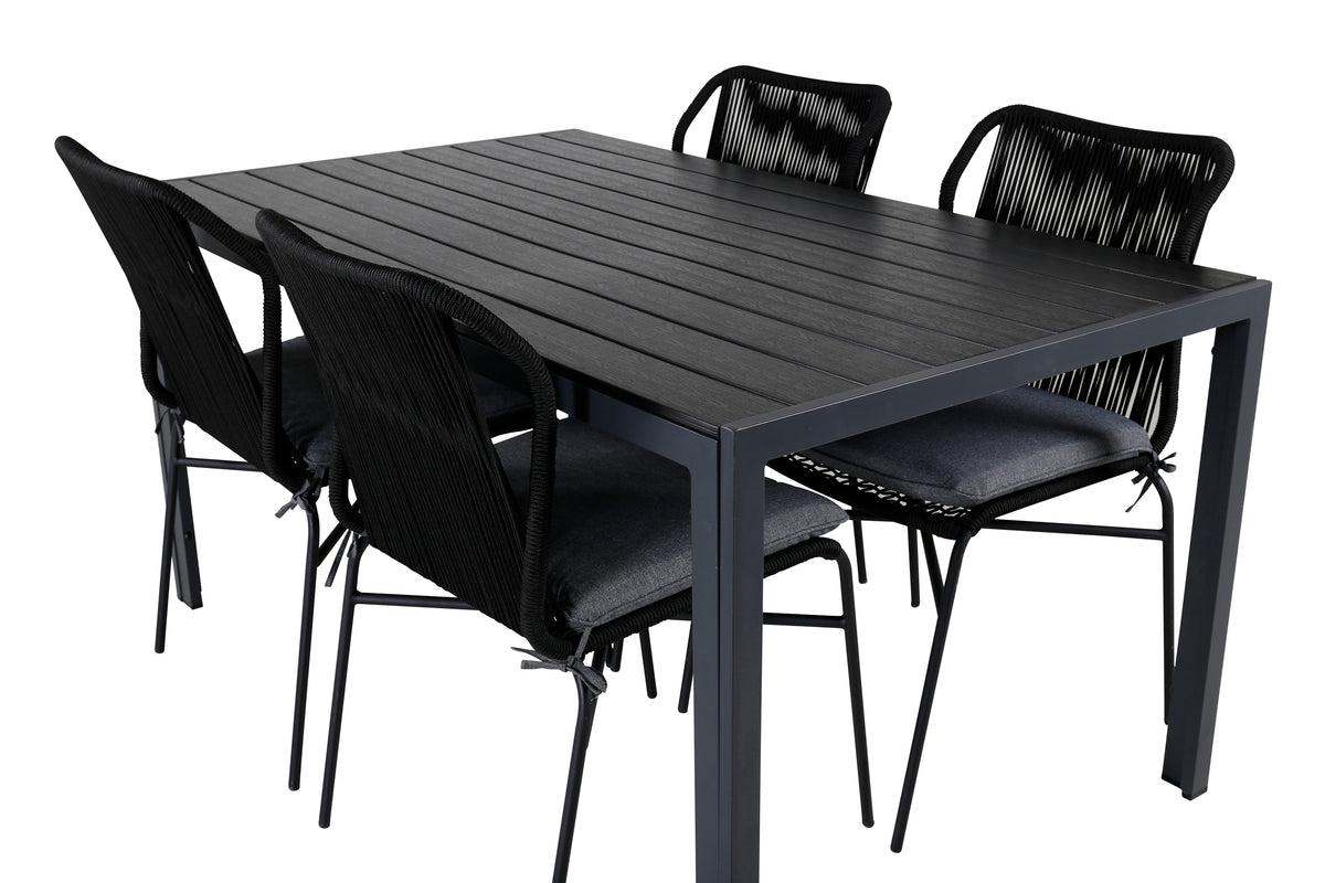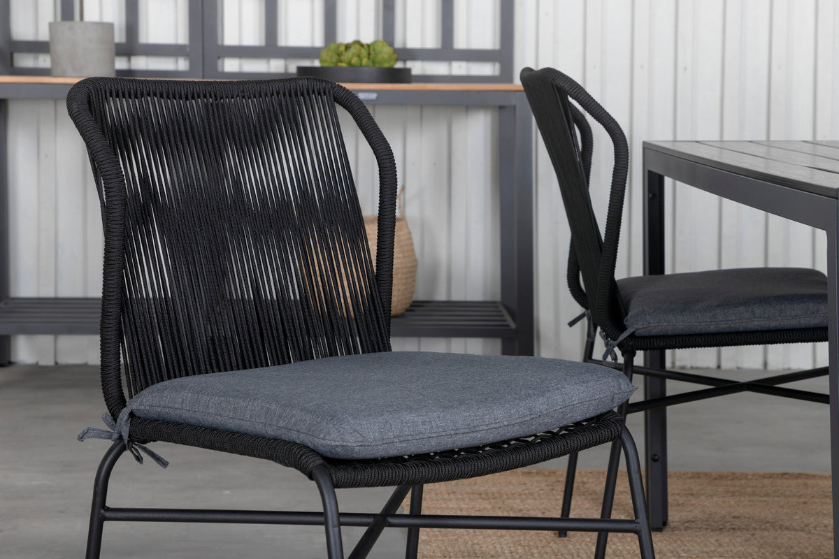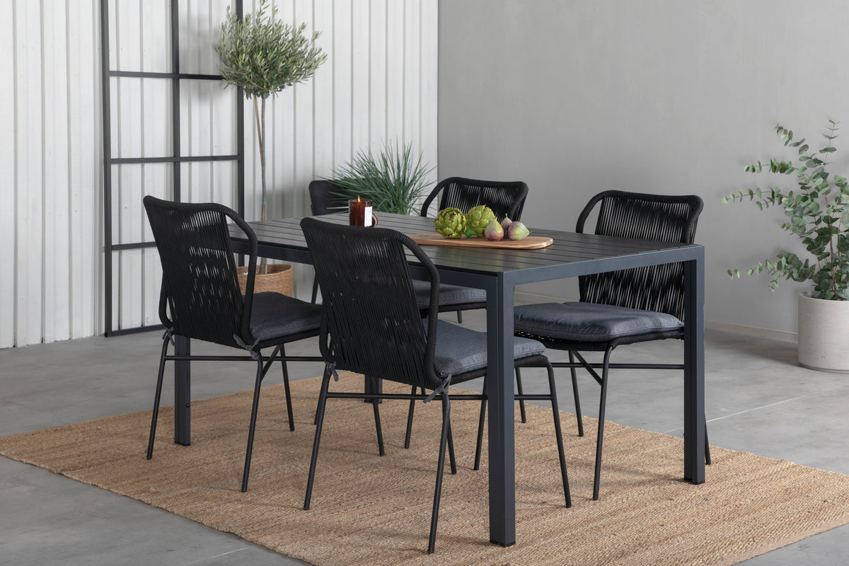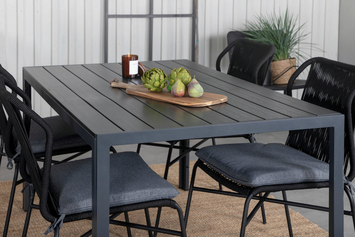 Julian er vores populære og stilrene spisestole med detaljer, der giver det lille ekstra. Fremstillet af slidstærkt sort reb og smal aluminiumskonstruktion. Her i perfekt kombination med vores rektangulære spisebord Break. Bordet har et klassisk design med en sort bordplade i plywood og understel i aluminium. Nyd udendørslivet i sommer og inviter nære og kære hjem til hyggelige middage!