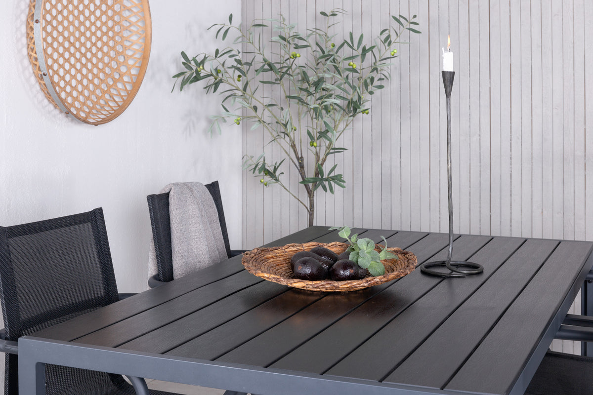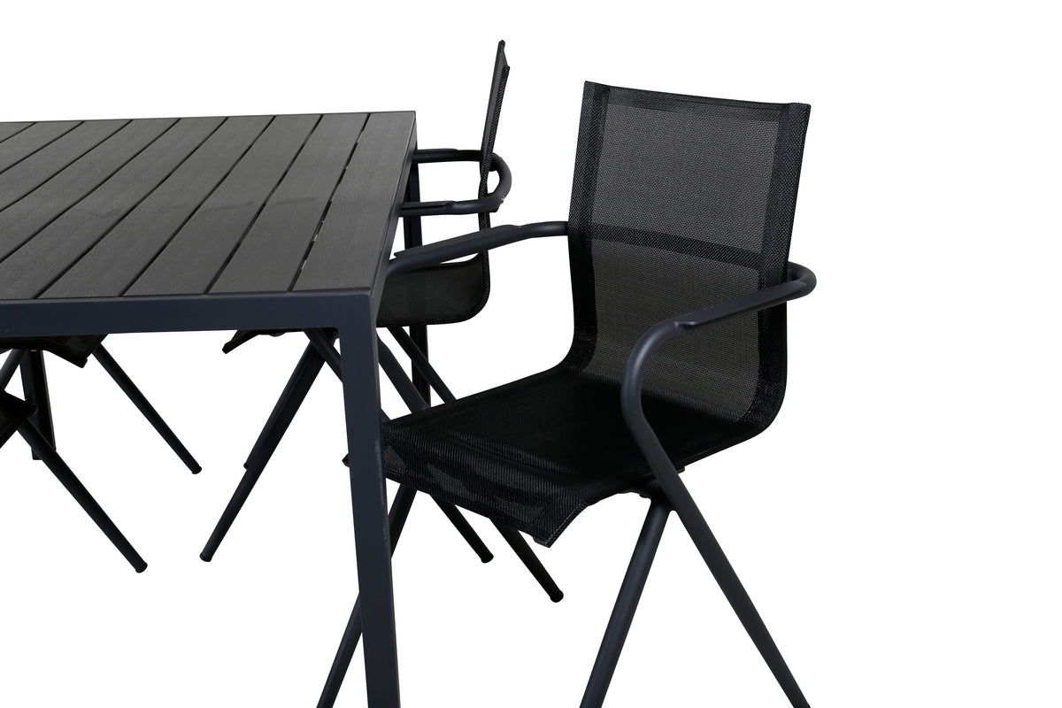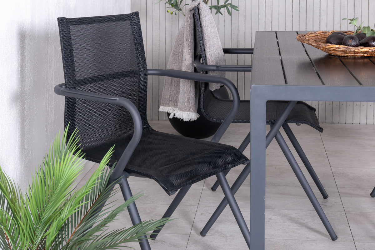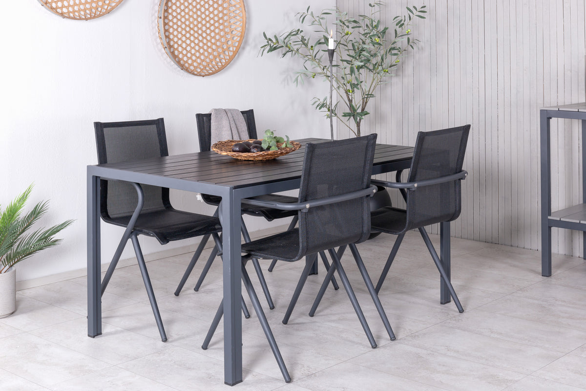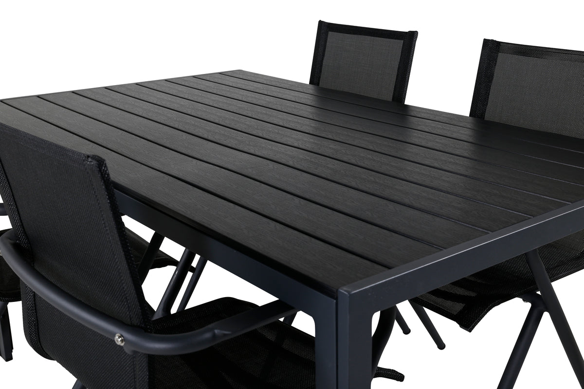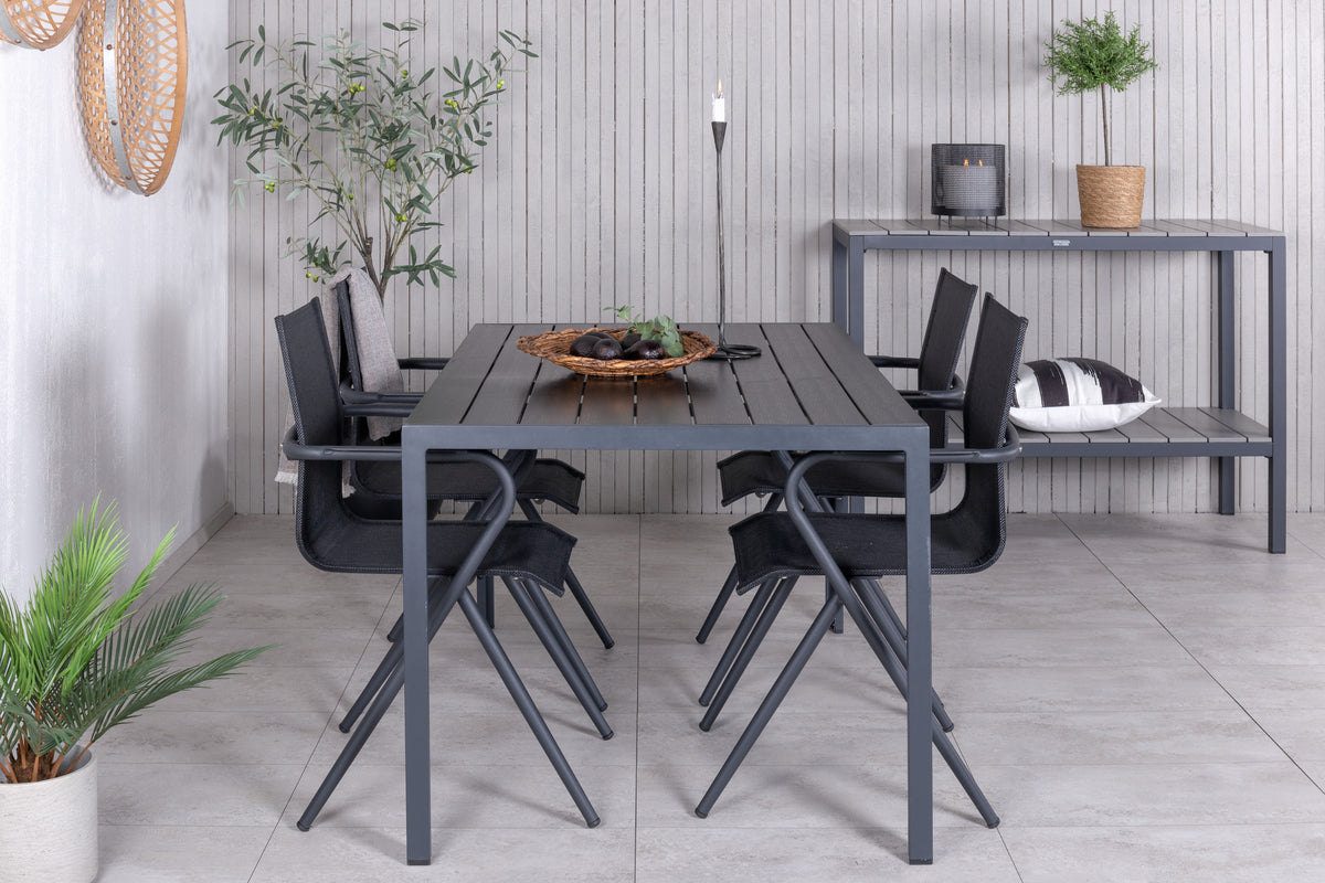 En sort og stilren spisegruppe - perfekt til den trendy udestue! Her kombinerer vi vores dejlige spisestole Alina i sort textilene med vores rektangulære spisebord Break i klassisk design. Bordpladen er i sort krydsfiner og understellet i aluminium - to slidstærke materialer, der holder over tid. Skab et moderne blikfang på terrassen i sommer og nyd hyggelige måltider i en komfortabel spisegruppe!