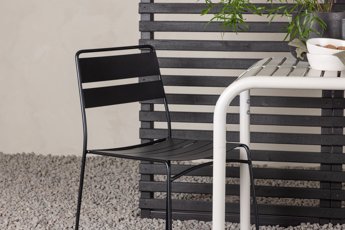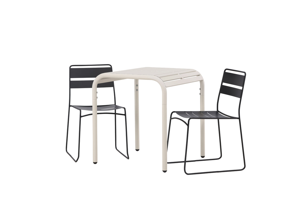Stilrent og minimalistisk - perfekt til den lille altan eller terrasse! Bordet fra serien Borneo har smidige former og et tidløst skandinavisk design. Bordpladen er ribbet og bølger ned langs kanterne ved benene. Gennemgående fremstillet i beige aluminium, hvilket giver dig et slidstærkt bord, der er let at flytte rundt på. Her sammen med vores smækre spisestole fra serien Lina. Den nette stol er i sort stål og matcher bordet udmærket. Nyd solrige fika-stunder til sommer!