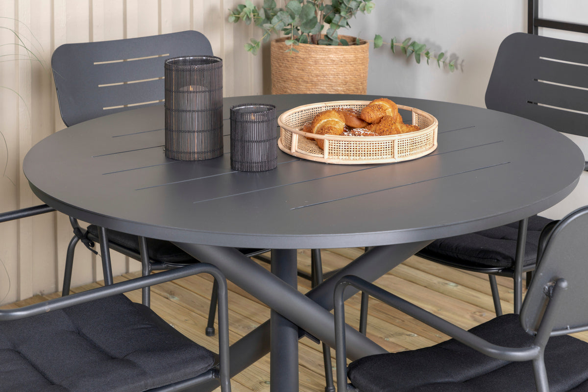 En lækkert matchende og stilren spisegruppe i tidløs sort farve! Her kombineres vores runde spisebord Alma i sort aluminium med nette spisestole fra serien Nicke i sort stål. Stolene har integrerede armlæn og et minimalistisk design - skab en indbydende atmosfære på terrassen til sommer!
