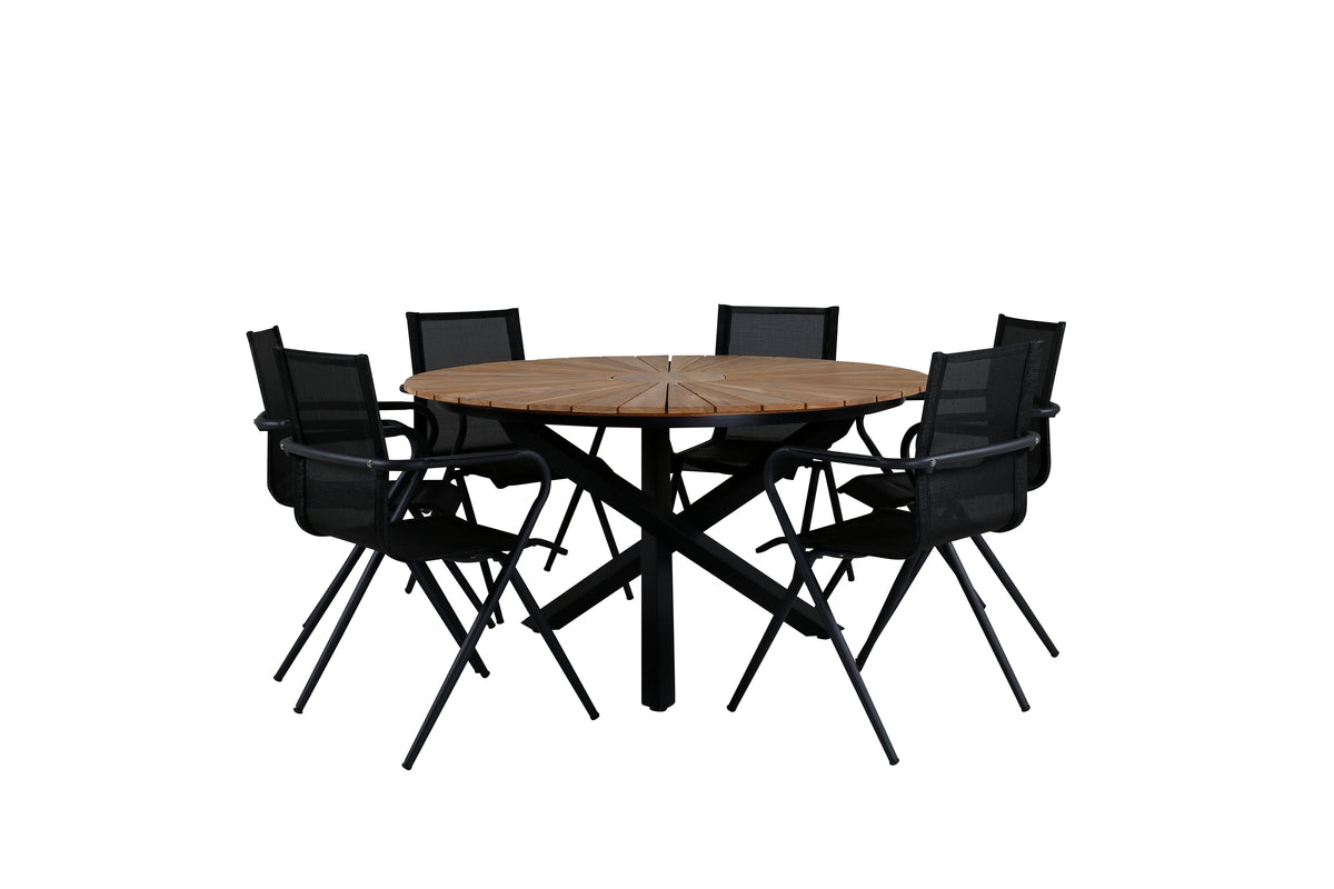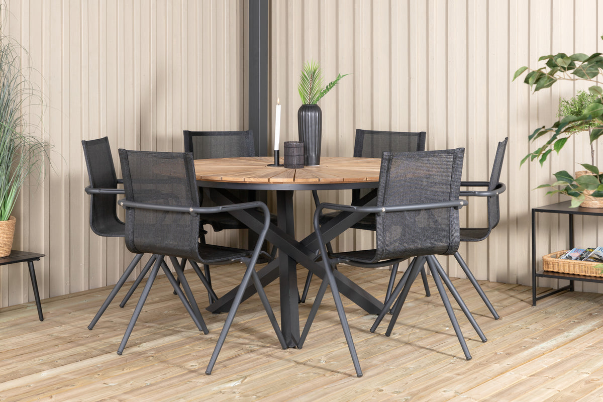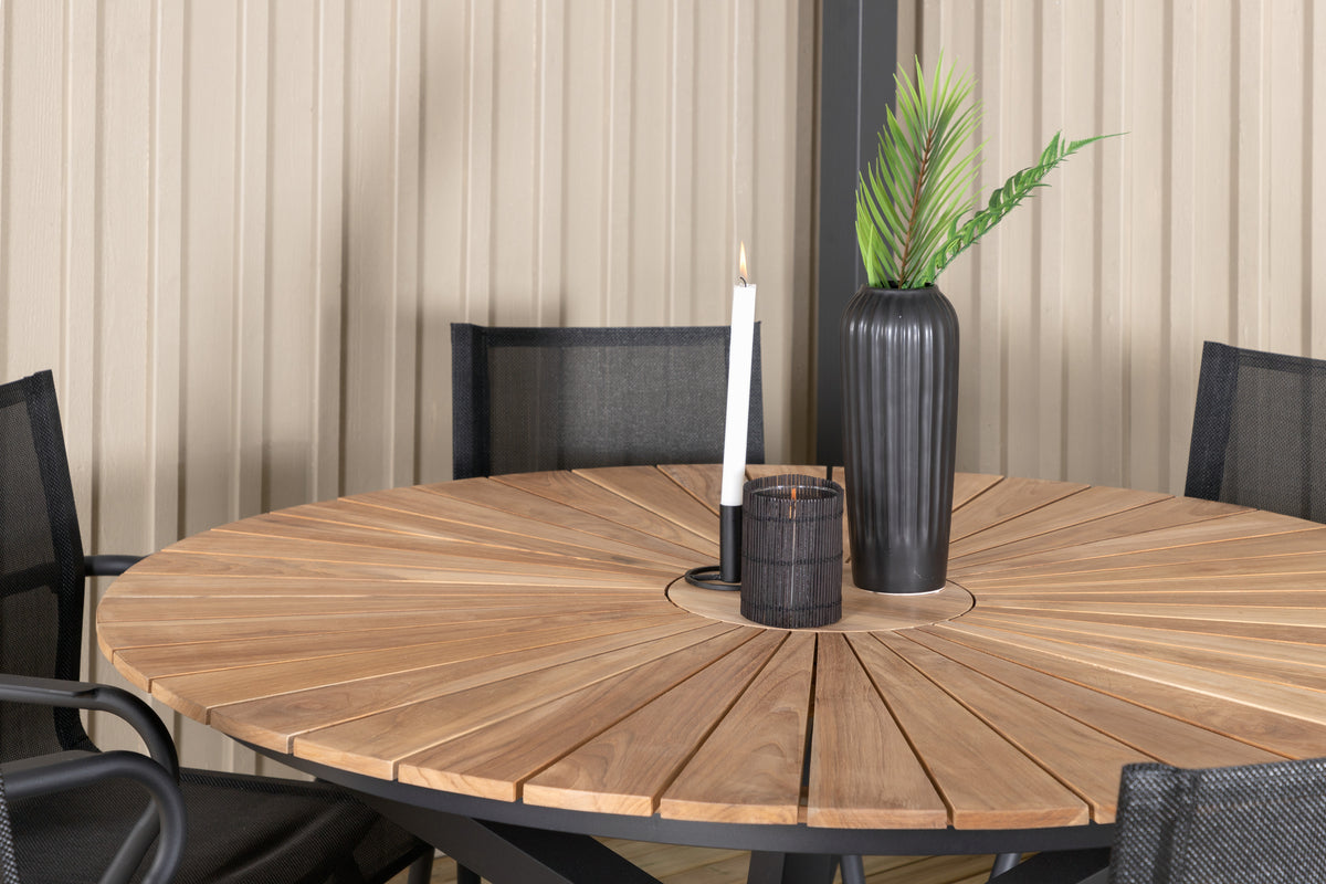 Skab en hyggelig atmosfære på terrassen! Mexico er et rundt spisebord med alt det rigtige: Flot, smart og slidstærkt. Her kan du samle dine kære omkring et holdbart spisebord i lækkert design, og ingen risikerer at havne på kanten. Bordpladen er i smuk teak og understellet i sort aluminium. Her i smækker kombination med vores komfortable spisestole Alina i sort textilene. Stolebenene er let udadgående i aluminium, hvilket er et fremragende match til bordet. Her får du et charmerende midtpunkt for dig og din familie at samles omkring!