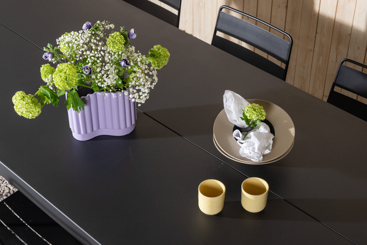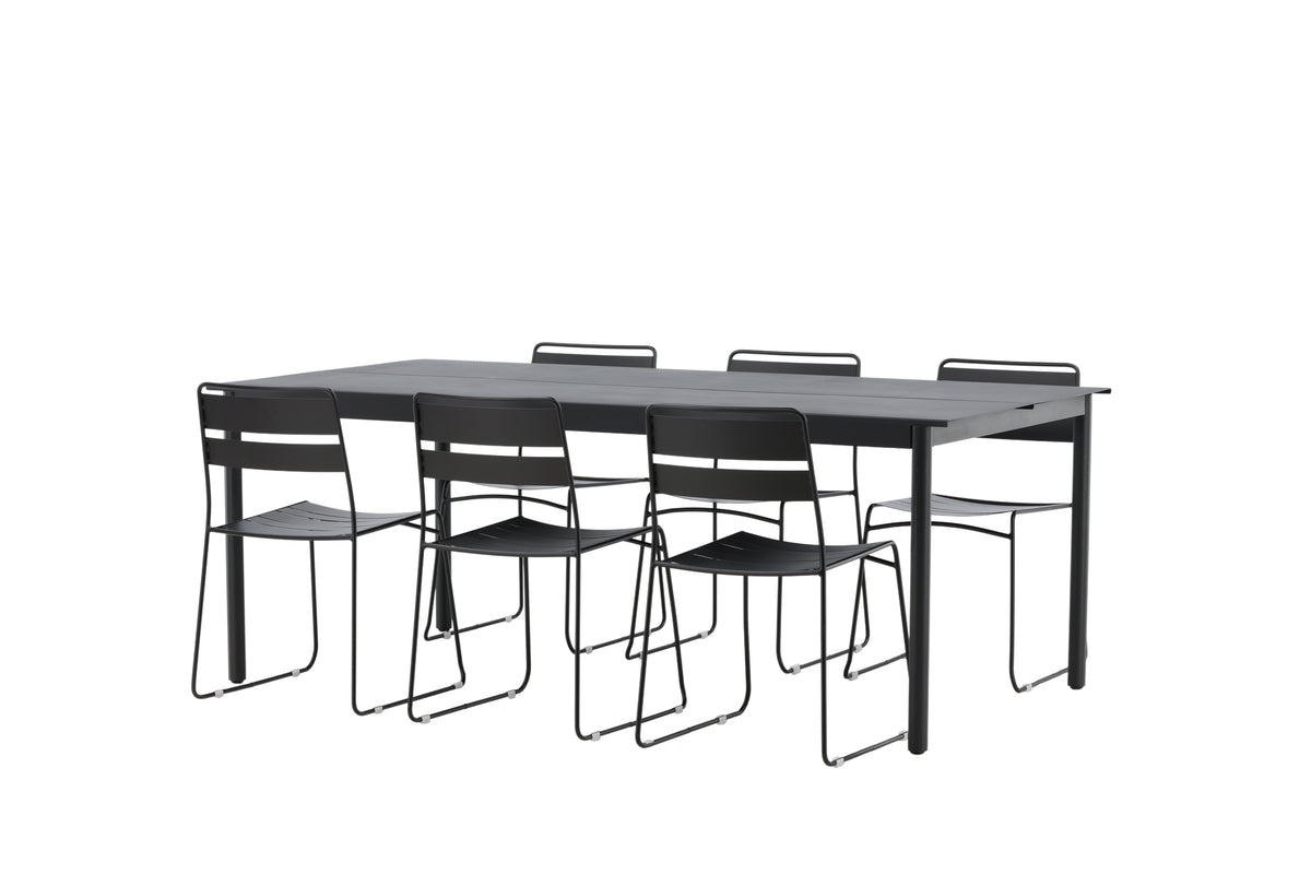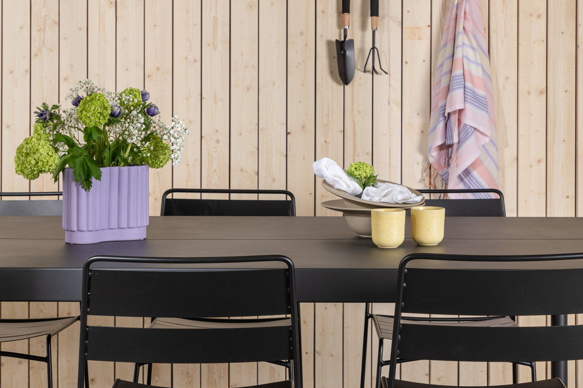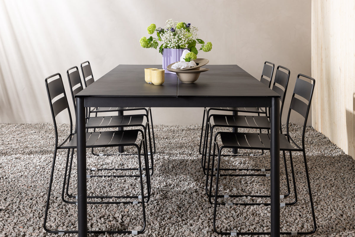 En spisegruppe med alt det rigtige - stilren, elegant og slidstærk! Modena er vores populære spisebord i lige nordiske former med en rektangulær bordplade i sort aluminium og cylinderformede ben i minimalistisk stil. Mål: 200x100 cm. Her i slank kombination med nette spisebordsstole fra serien Lina. Stolene er stilrene i skandinavisk design, fremstillet i sort stål og passer udmærket i både udestuen og ude på terrassen. Det smalle design gør stolene lette at tilpasse og nemme at møblere!