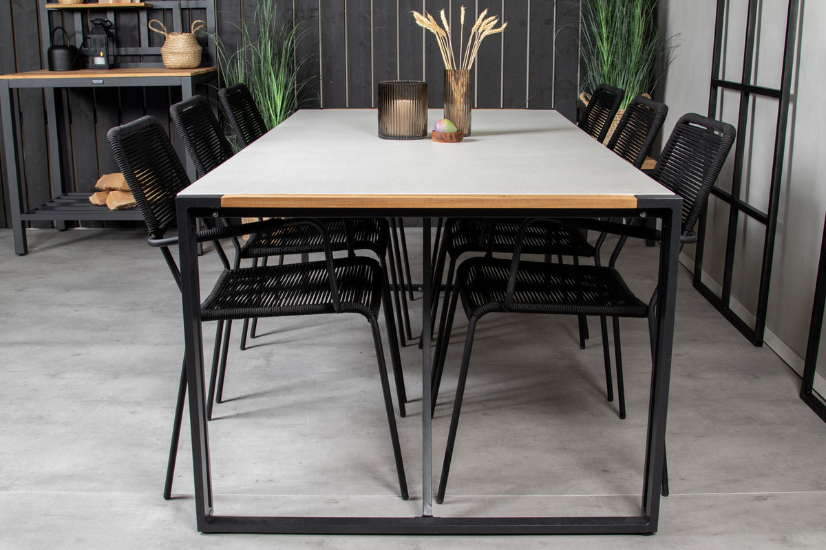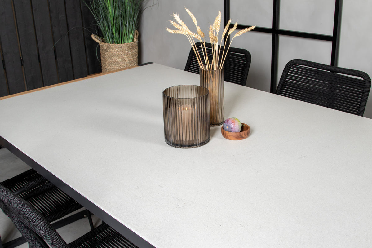 Spisebord Texas i et slankt design, sammen med spisebordsstole Lindos med et sæde i sort vævet reb – den perfekte kombination til dig, der vil have en trendy spisegruppe på terrassen. Stolens høje siddekomfort inviterer til lange og dejlige stunder med hygge!