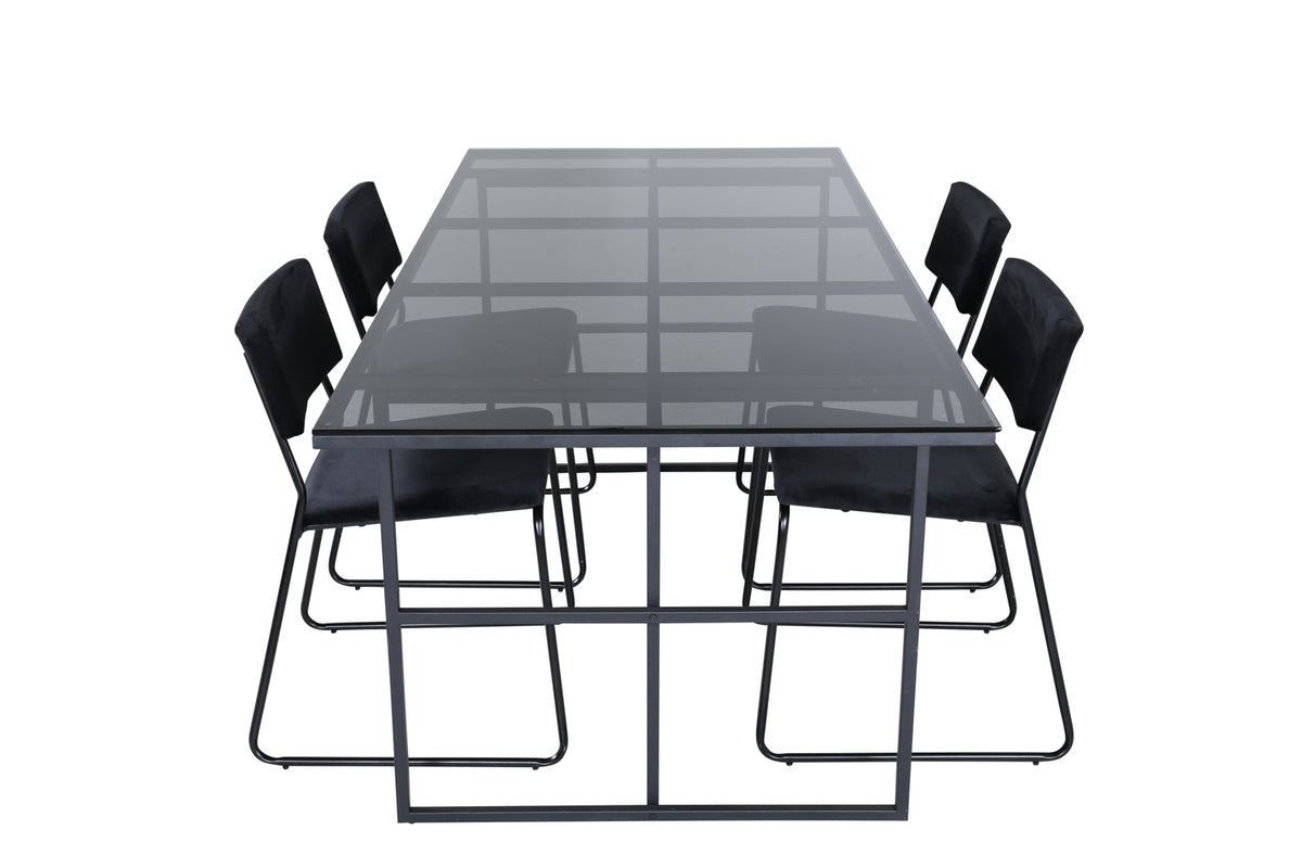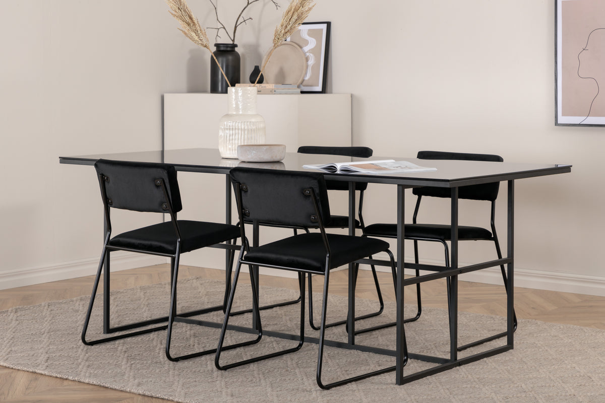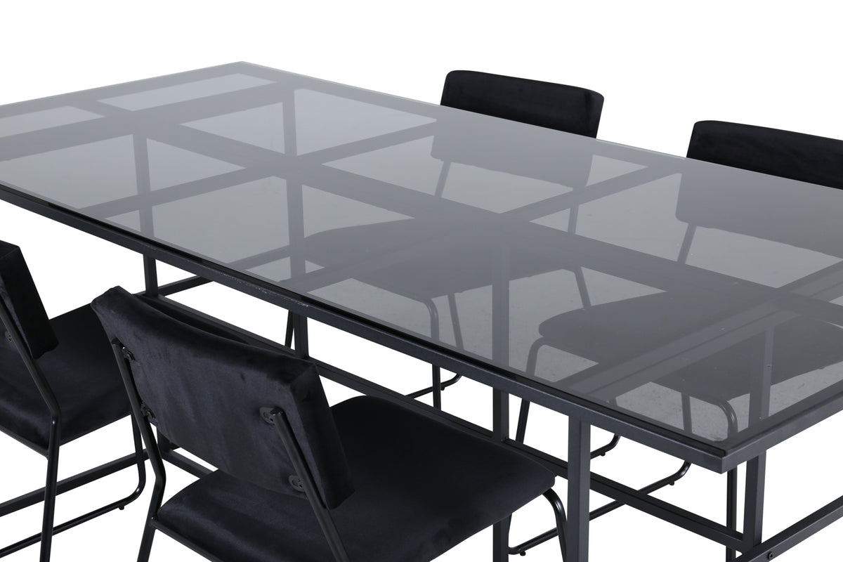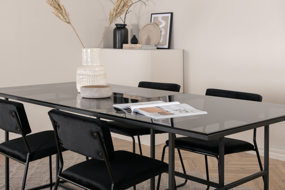 En lækkert matchende spisegruppe, der emmer af minimalisme og industrielt design! Spisebord Leif har et iøjnefaldende design med en elegant bordplade i røget sort glas og stel i sort metal - inspireret af de industrielle vægge, der klatrer på trendlisterne. Bordets mål: Længde: 200cm, Bredde: 90cm, Højde: 74cm. Her sammen med 4 stk. Kenth spisebordsstole i sort velourstof og sorte stoleben i jern. Stolens mål: Højde: 76cm, Siddehøjde: 48,5cm, Bredde: 40cm, Dybde: 52cm. Spisegruppen giver et luftigt indtryk til rummet og skaber en hyggelig atmosfære!