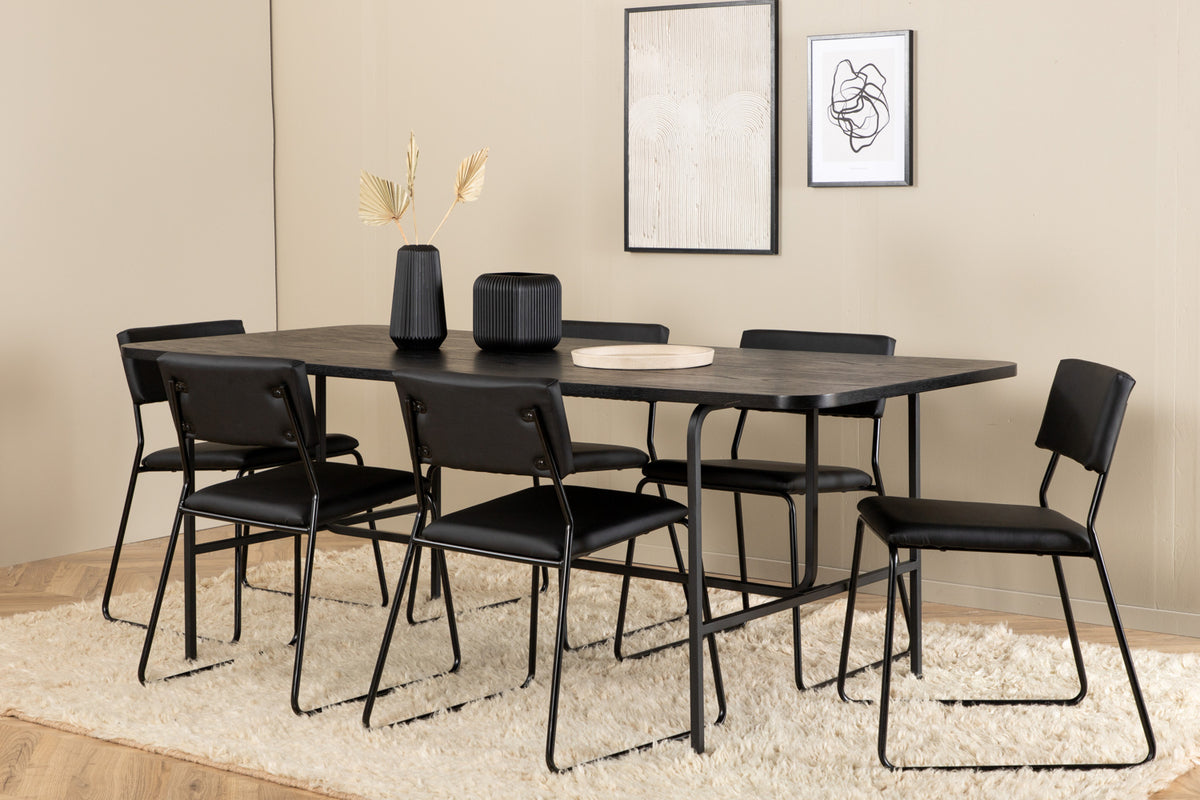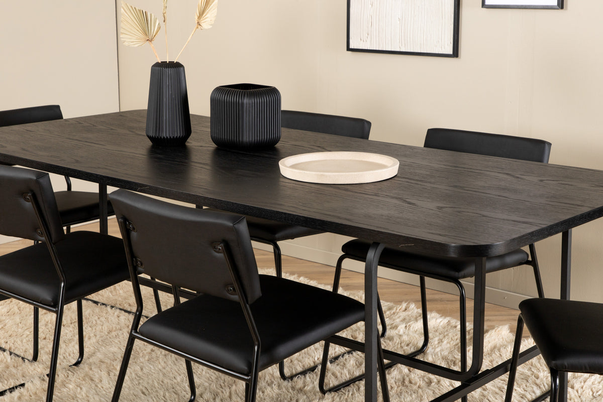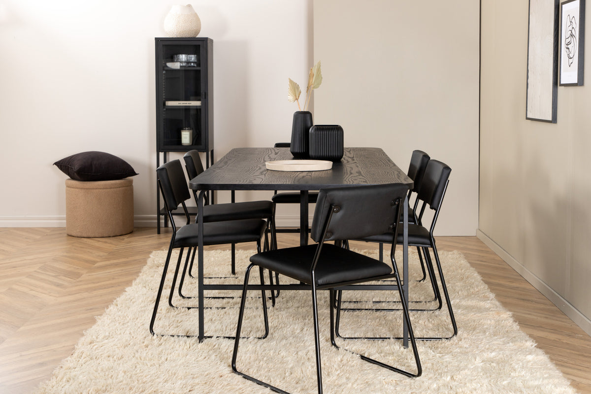 Stilren og luftig spisegruppe til alle lejligheder - møbler stuen smart og indbydende! Spisebord Uno er rektangulært udformet med let afrundede hjørner, en bordplade i sort MDF med finer samt stilrent understel i sort metal. Bordets mål: Længde: 200cm, Bredde: 90cm, Højde: 74cm. Her i slank kombination med 6 stk. Kenth spisebordsstole i minimalistisk design. Stolebenene er stilrent smalle i sort jern og sæderne i kæk sort kunstlæder. Stolens mål: Højde: 76cm, Siddehøjde: 48,5cm, Bredde: 40cm, Dybde: 52cm. Nyd hyggelige måltider fremover!