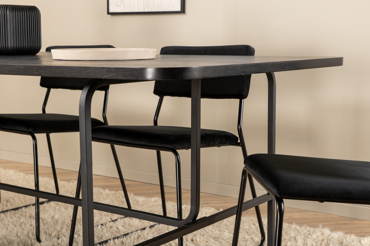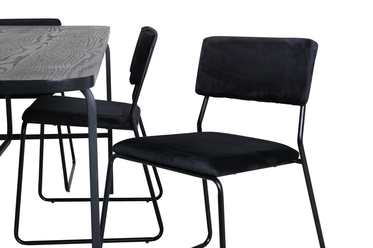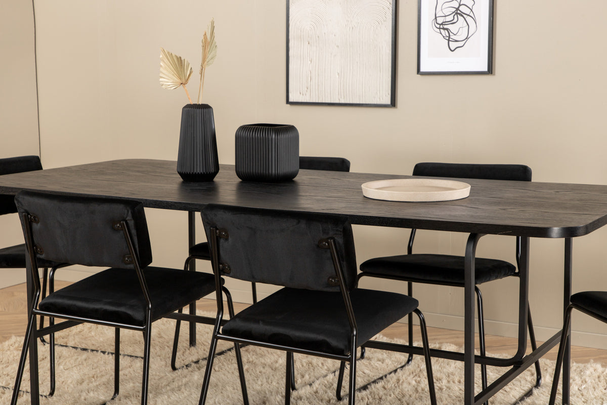 Stilren og luftig spisegruppe til alle lejligheder - møbler stuen smart og indbydende! Spisebord Uno er rektangulært udformet med let afrundede hjørner, en bordplade i sort MDF med finer samt stilrent understel i sort metal. Bordets mål: Længde: 200cm, Bredde: 90cm, Højde: 74cm. Her i slank kombination med 6 stk. Kenth spisebordsstole i minimalistisk design. Stolebenene er stilrent smalle i sort jern og sæderne i sort fløjl. Stolens mål: Højde: 76cm, Siddehøjde: 48,5cm, Bredde: 40cm, Dybde: 52cm. Nyd hyggelige måltider fremover!