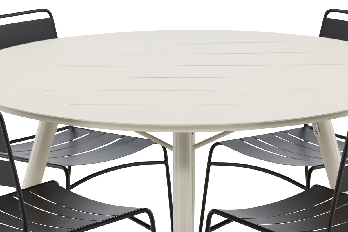 En lækkert matchende spisegruppe fra serien Lina er lige hvad der skal til for at friske terrassen op til sommer! Bordet har et minimalistisk design i hvidt/beige stål, med en rund bordplade og let udadgående bordben. Mål: 120ø cm. Stolene er stilrene i skandinavisk design, fremstillet i sort stål og passer udmærket i både udestuen og ude på altanen. Det smalle design gør stolene lette at tilpasse og nemme at møblere. Her får du en spisegruppe, der holder over tid!