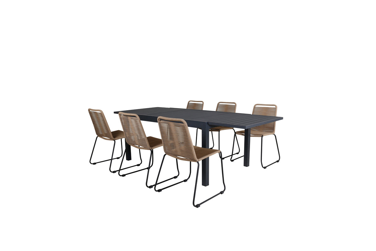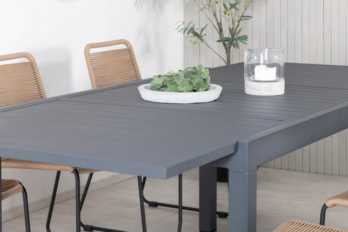 Spisebord Marbella sammen med spisebordsstole i serien Lindos – komfortabelt, hyggeligt og indbydende! Neutrale farver, der skaber en rolig følelse i udestuen og inviterer til mange dejlige sociale stunder. Bordet er forlængeligt.
