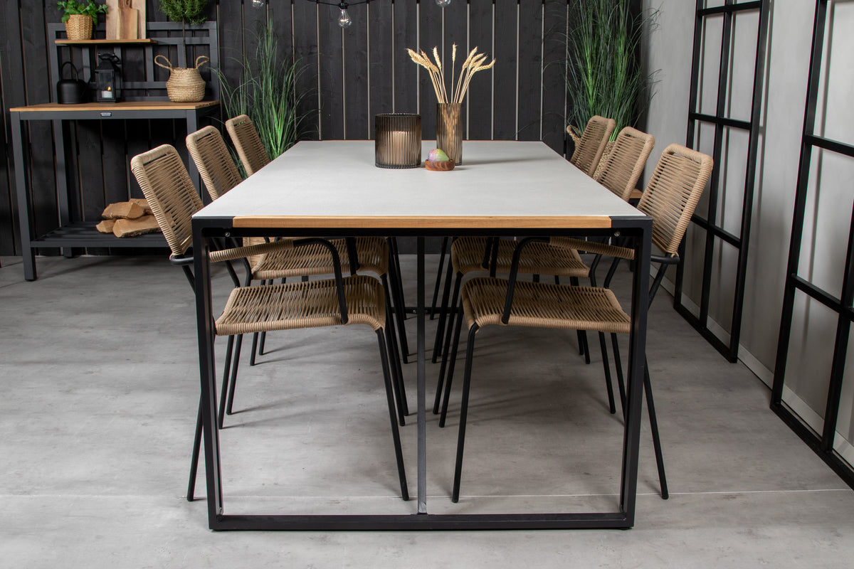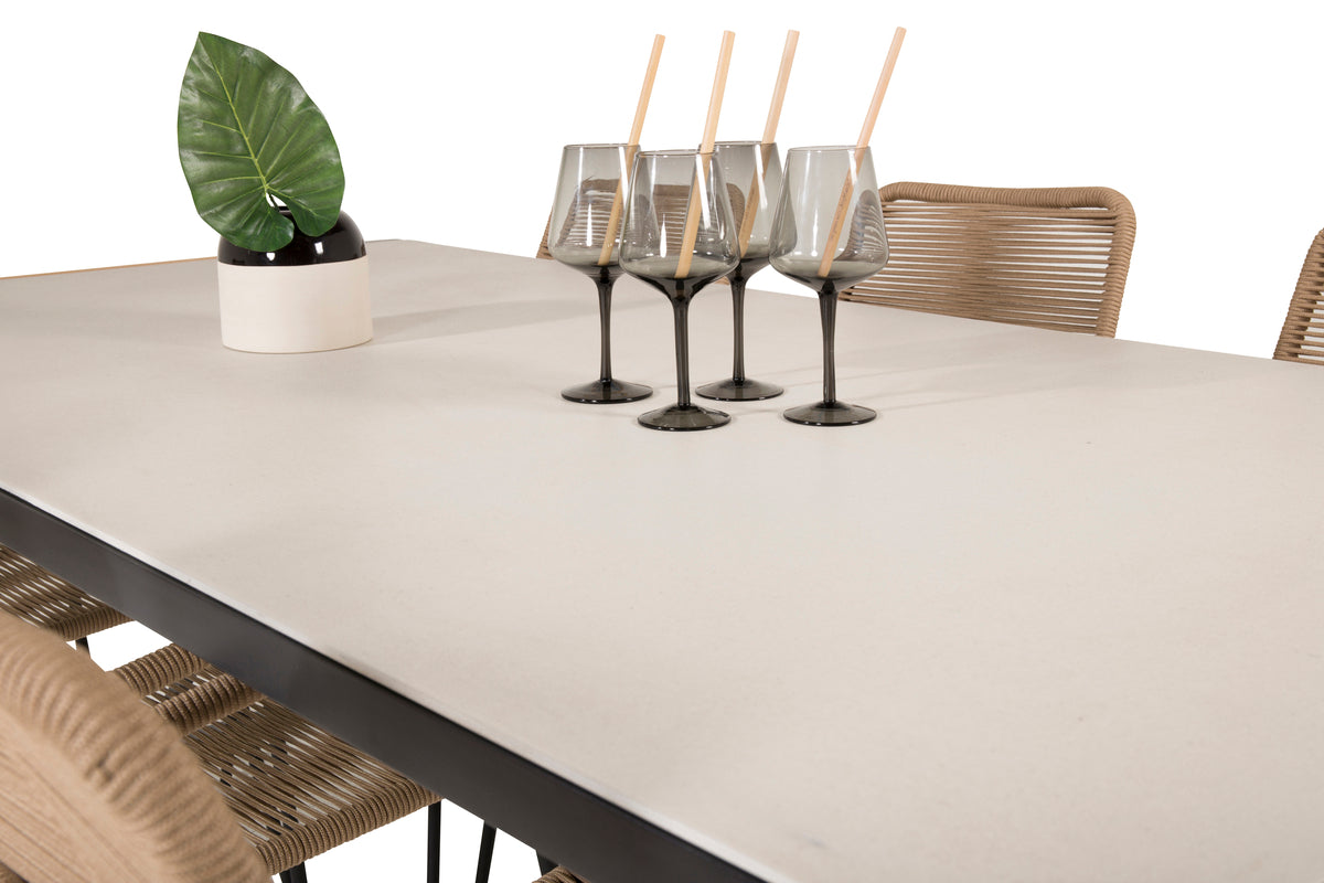 Spisebord Texas i et slankt design, sammen med spisestole Lindos med sæde i brunt vævet reb – den perfekte kombination til dig, der ønsker en trendy spisegruppe på terrassen. Stolens høje siddekomfort indbyder til lange og dejlige stunder med samvær!