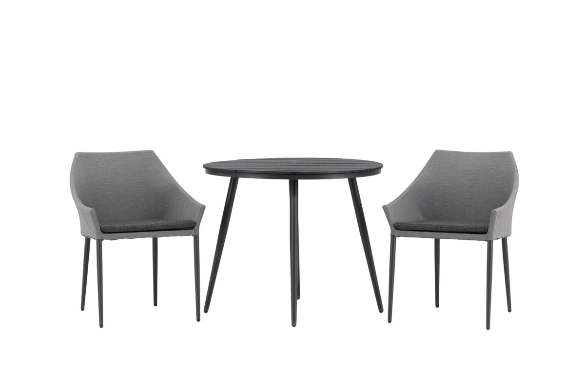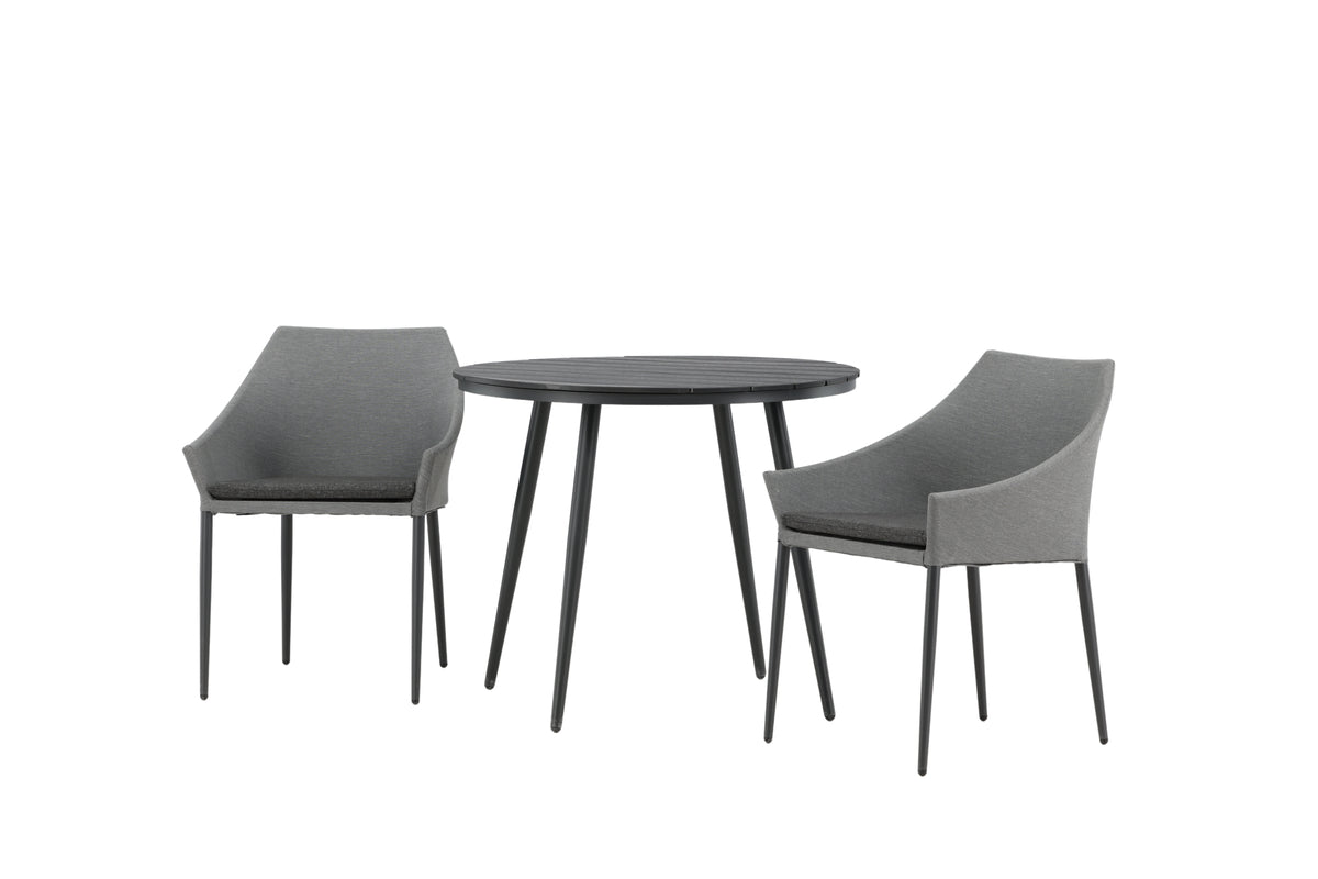 En indbydende spisegruppe for to, der garanteret forlænger hyggelige stunder til sommer! Bordet Break har en rund bordplade i aintwood og et klassisk understel i sort aluminium. Mål: 90ø cm. Her sammen med trendsikre spisestole fra serien Spoga, en stol med fokus på stil og komfort. Det indbydende sæde er let afrundet i gråt stof, og benene er i sort stål. Dæk op til morgenmad eller aftenkaffe og nyd sommerlige dage!