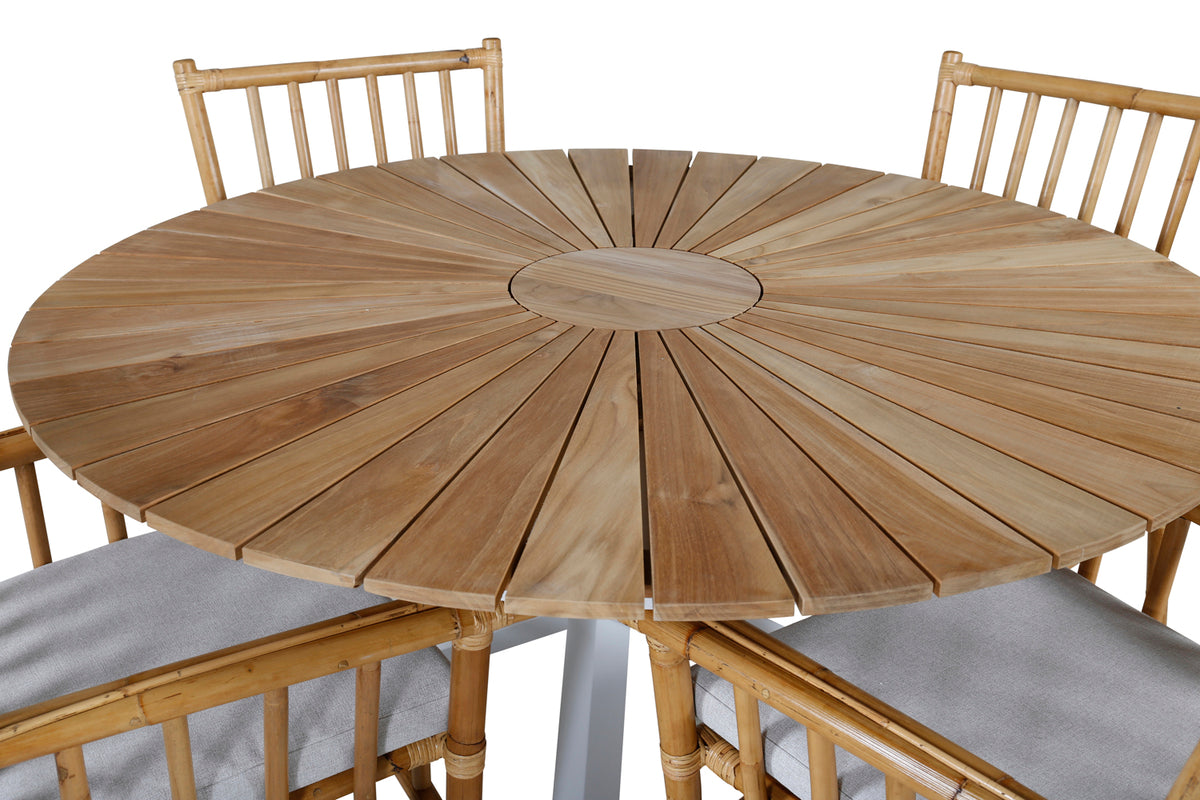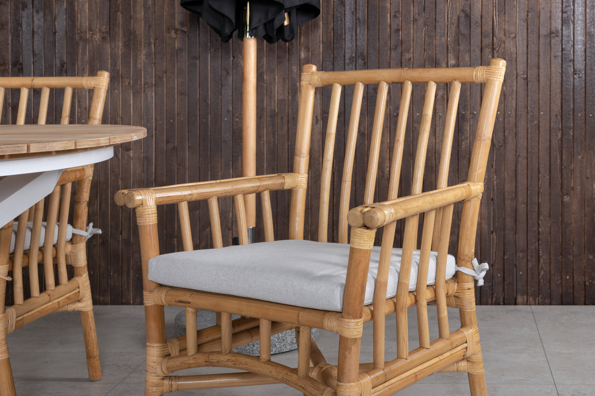 En trendsikker spisegruppe i tropisk design! Her kombineres vores runde spisebord Mexico med bambusstole fra serien Cane. Sid behageligt og moderne i sommer i en iøjnefaldende spisegruppe med luksuriøs følelse!
