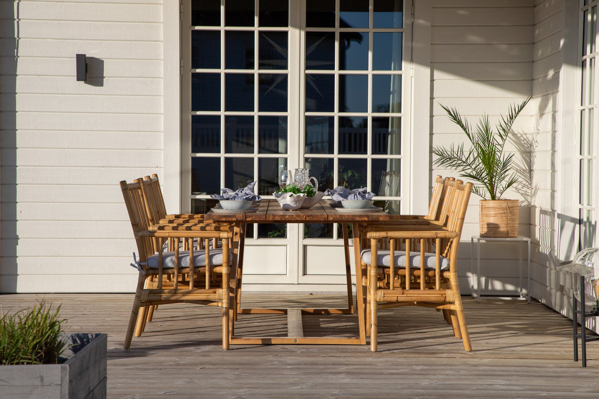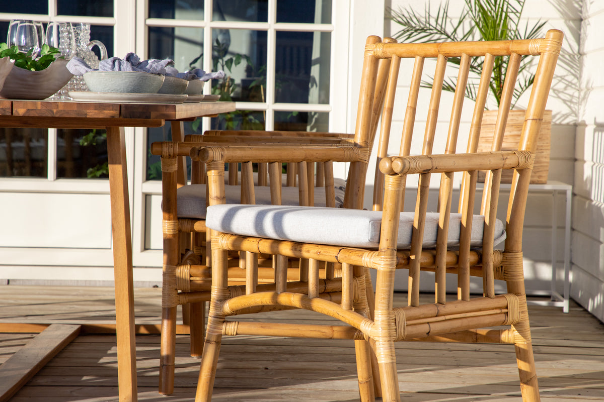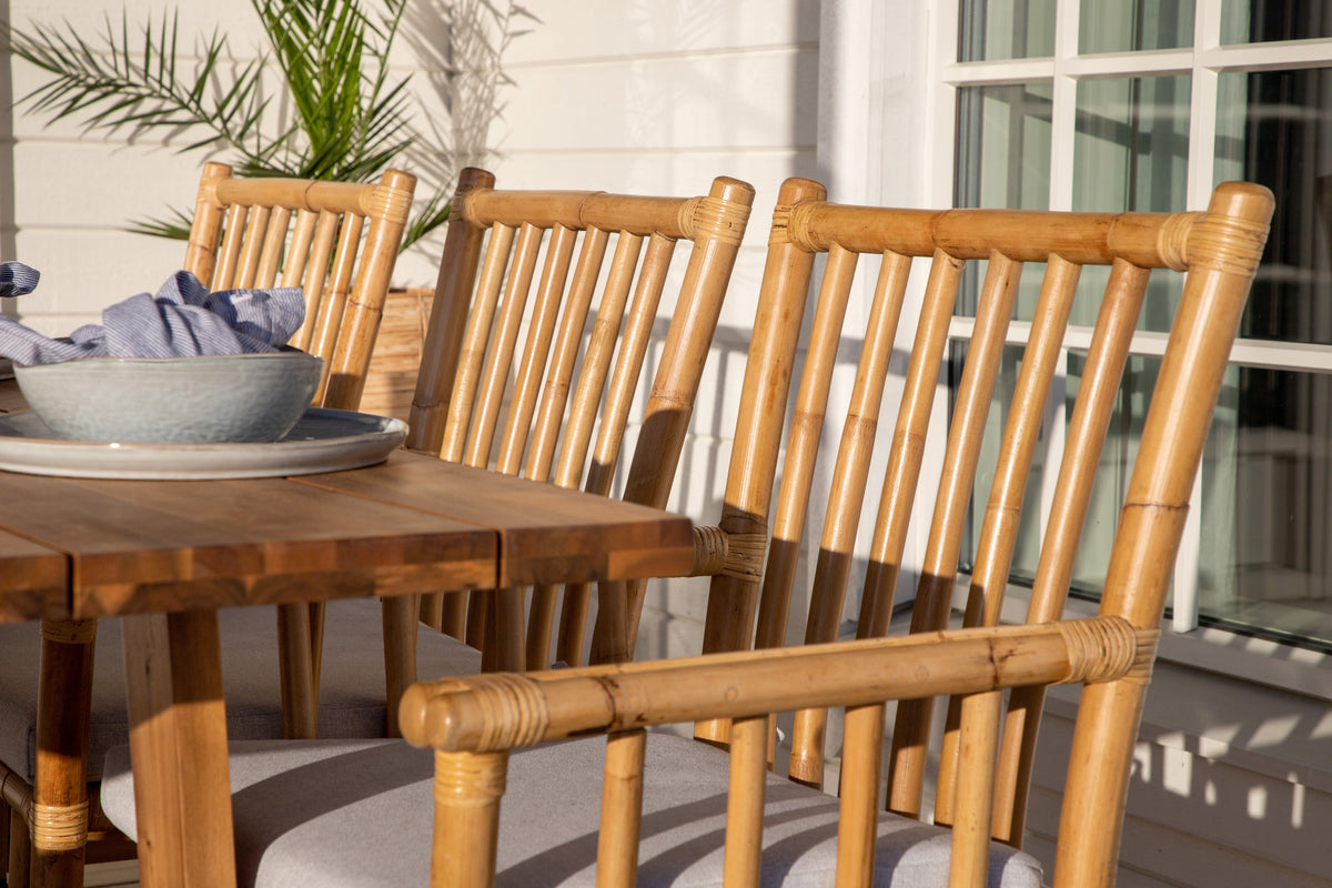 En moderne spisegruppe med indbydende og luksuriøs følelse! Vores smukke spisebord Plankton i lækkert træ kombineres perfekt med vores trendsikre bambusstole Cane. Saml familien til en solrig sommerfrokost i denne iøjnefaldende spisegruppe i stilrent design!