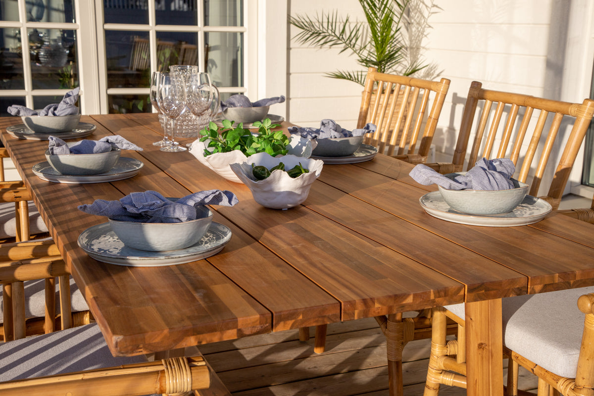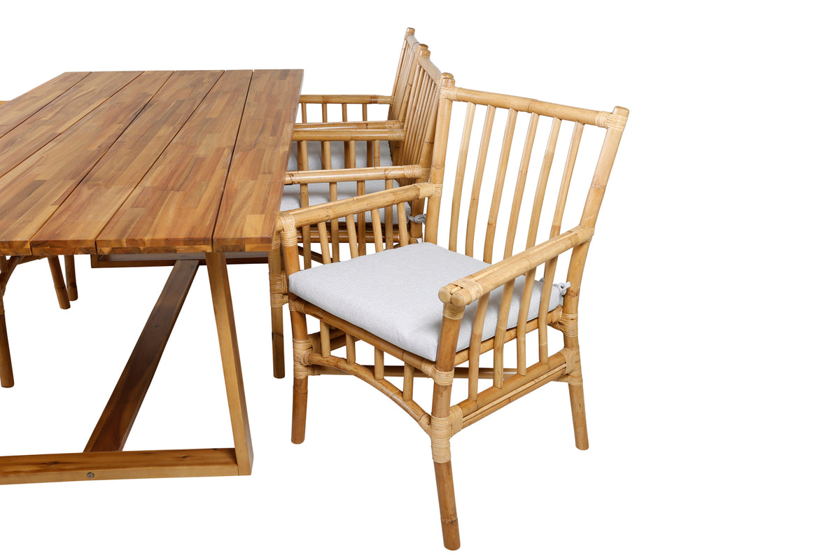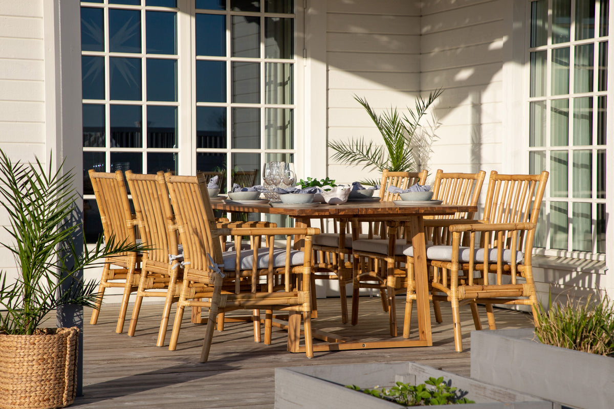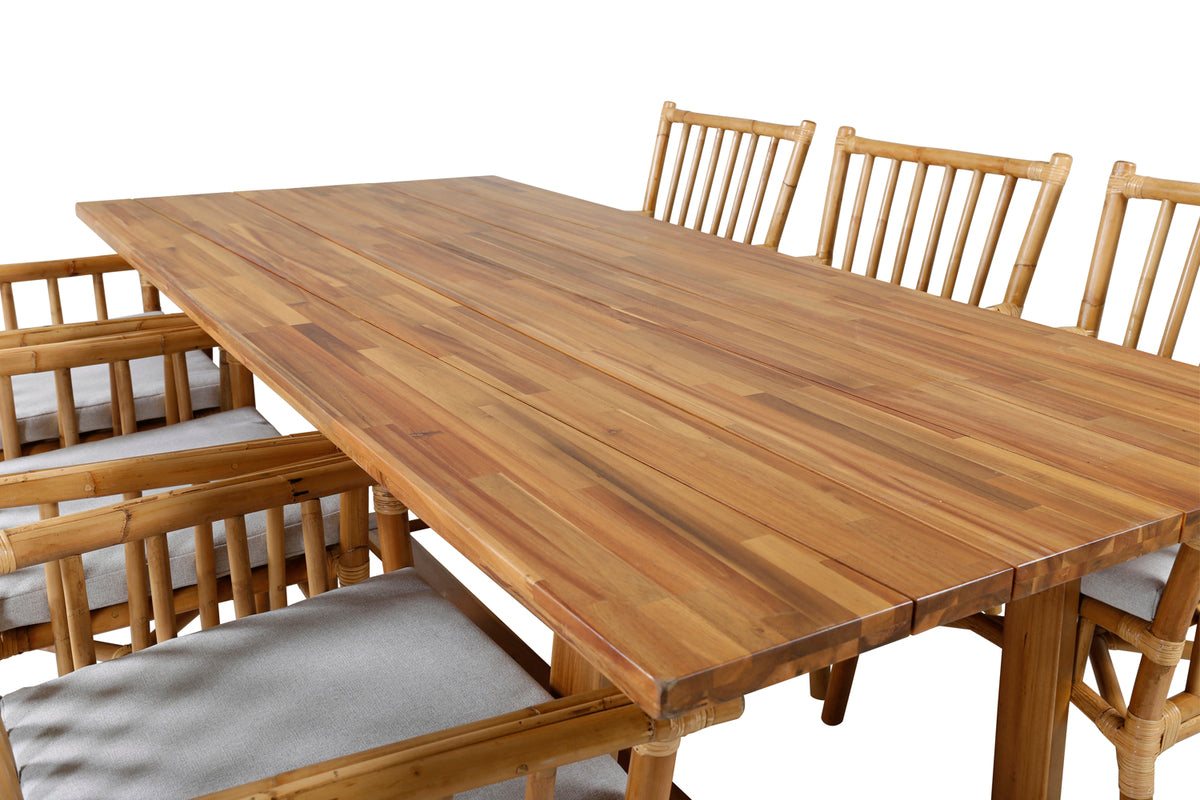 En moderne spisegruppe med indbydende og luksuriøs følelse! Vores smukke spisebord Plankton i lækkert træ kombineres perfekt med vores trendsikre bambusstole Cane. Saml familien til en solrig sommerfrokost i denne iøjnefaldende spisegruppe i stilrent design!