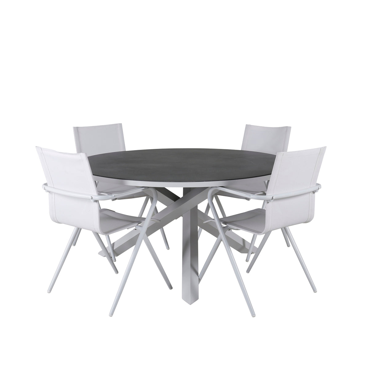 Copacabana, vores runde spisebord, der skaber en familiær følelse på terrassen! Her i kombination med stilsikre spisestole i serien Alina. Nyd en solrig sommerfrokost sammen med familien i denne komfortable og moderne spisegruppe!