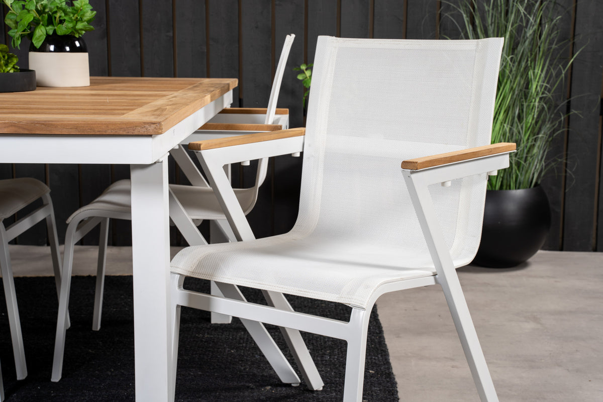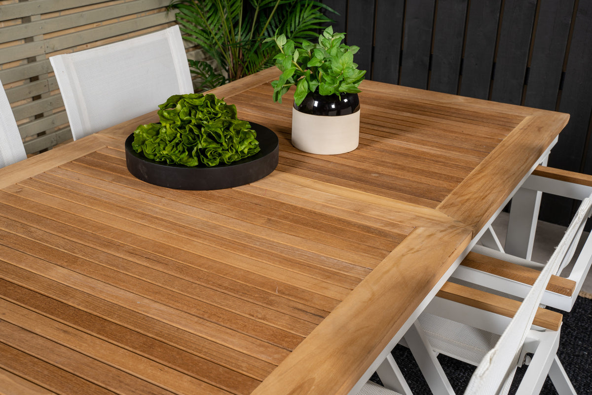 Klassisk og stilrent! Panama spisebord i hvid aluminiumskonstruktion og en bordoverflade i teak, sammen med hvide Mexico spisestole inviterer til mange hyggelige stunder fremover! Bordet er forlængeligt.