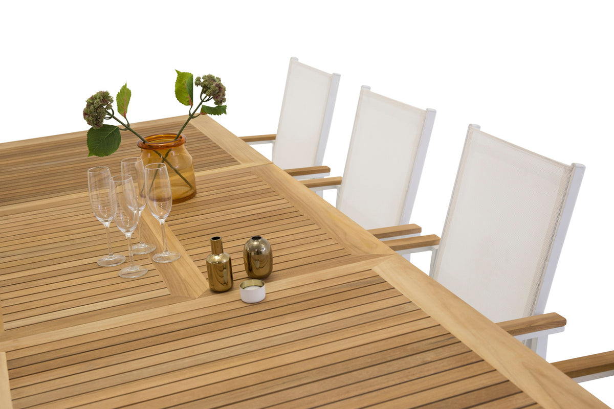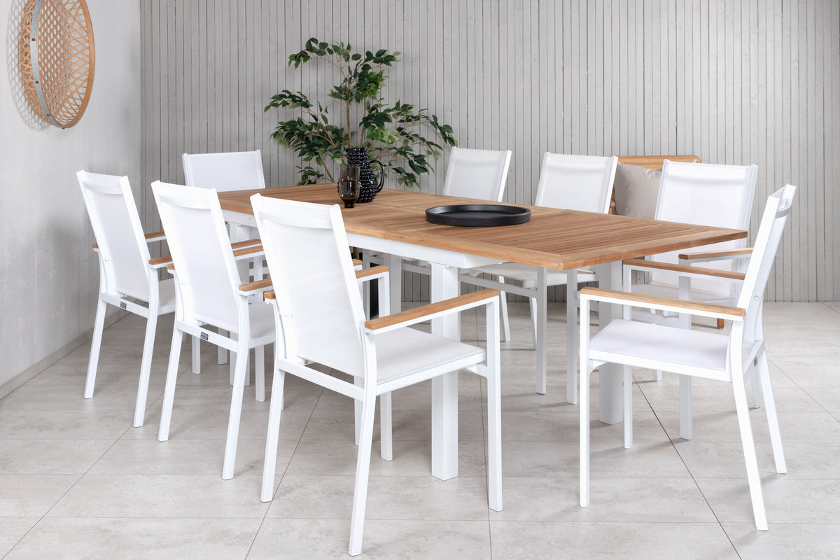 Denne spisegruppe kombinerer flot træ med stilrent design! Spisebord Panama passer til alle lejligheder, her sammen med trendsikre spisestole i serien Texas. Gør dig klar til sommerens dejlige udeliv!