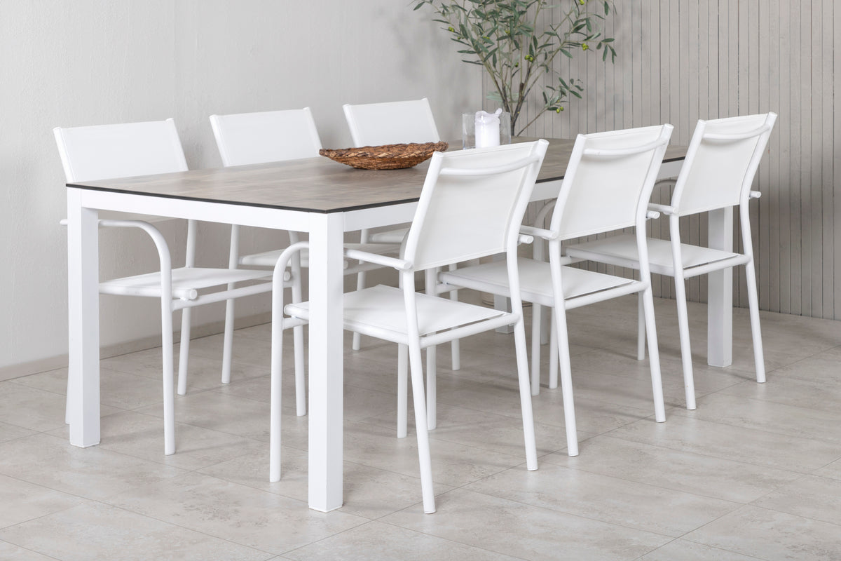 Llama, et stilfuldt spisebord med en bordplade i let gråmønstret HPL matches her med stolene Santorini, som giver dig en terrasse at længes hjem til. Stolene er velproportionerede – her sidder du gerne længe og nyder gode venners selskab!