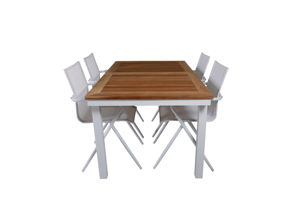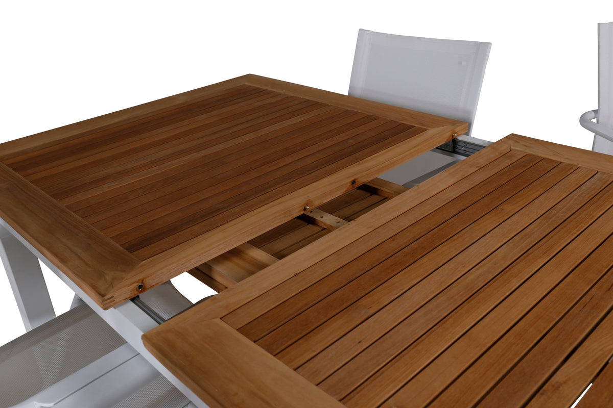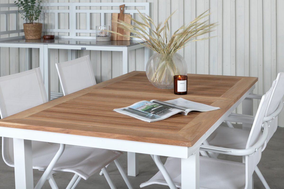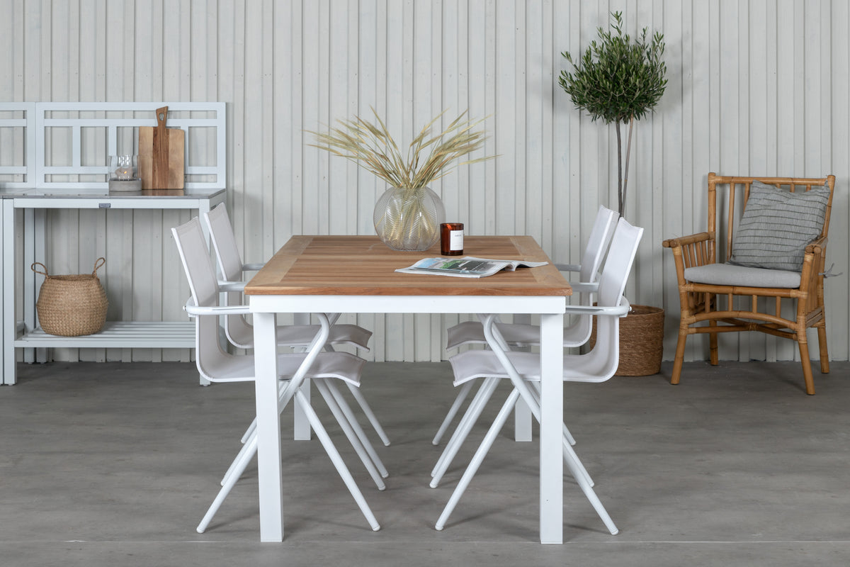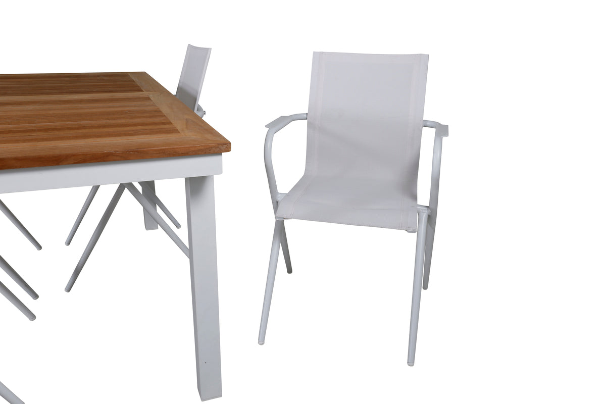 En lys og trendsikker spisegruppe i smuk teak! Panama er et forlængeligt spisebord i rektangulær form. Bordpladen er i smuk teak og understellet i hvid metal. Her sammen med vores komfortable spisestole fra serien Alina i hvid textilene med let udsvungne ben i aluminium - perfekt match til bordet. Udvid middagsinvitationerne og nyd hyggelige måltider med familie og venner!