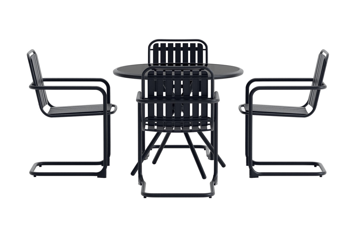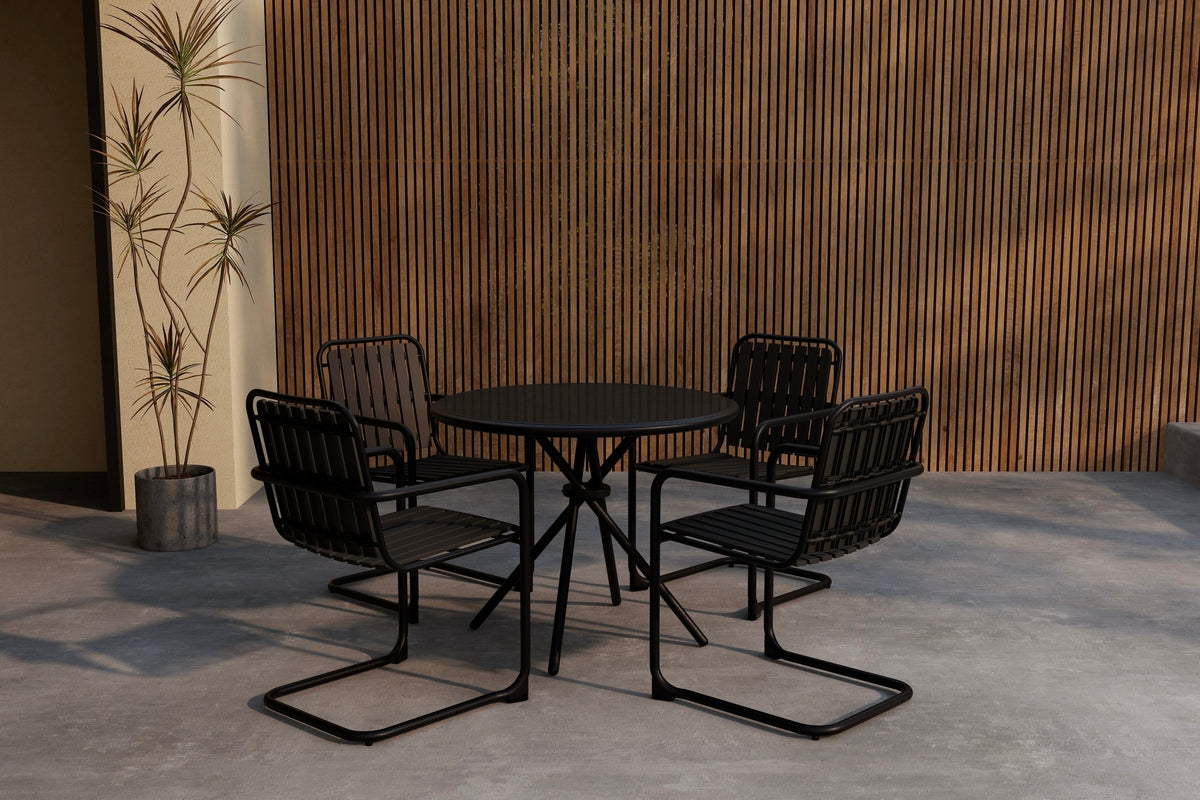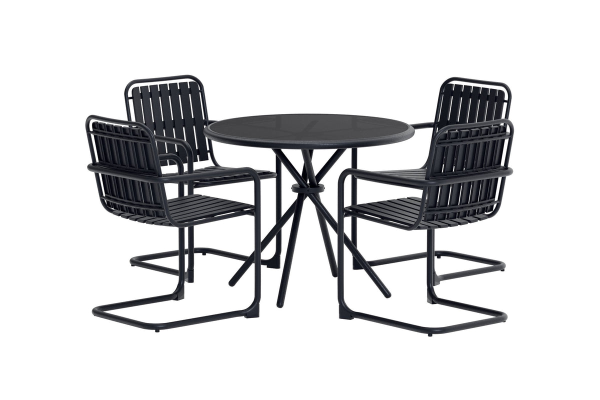 Chios spisegruppe i sort er en moderne og indbydende løsning til terrassen eller balkonen. Gruppen består af et rundt bord på 90 cm og fire stole med elegant flettet design og bekvemme former, der gør, at du gerne sidder længe. Den stilrene sorte farve giver et sofistikeret udtryk og gør det nemt at matche med andre udemøbler. Med Chios spisegruppe får du både funktion og design i ét – perfekt til alt fra morgenmad i solen til middage med venner.