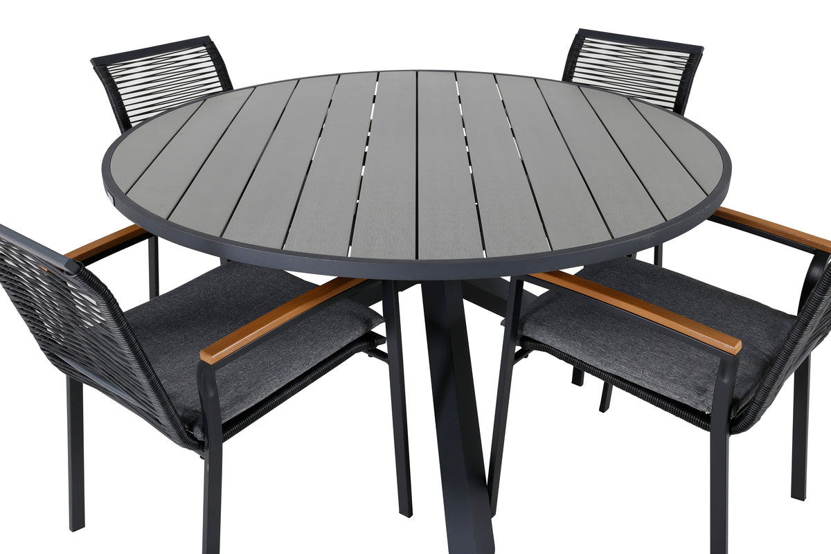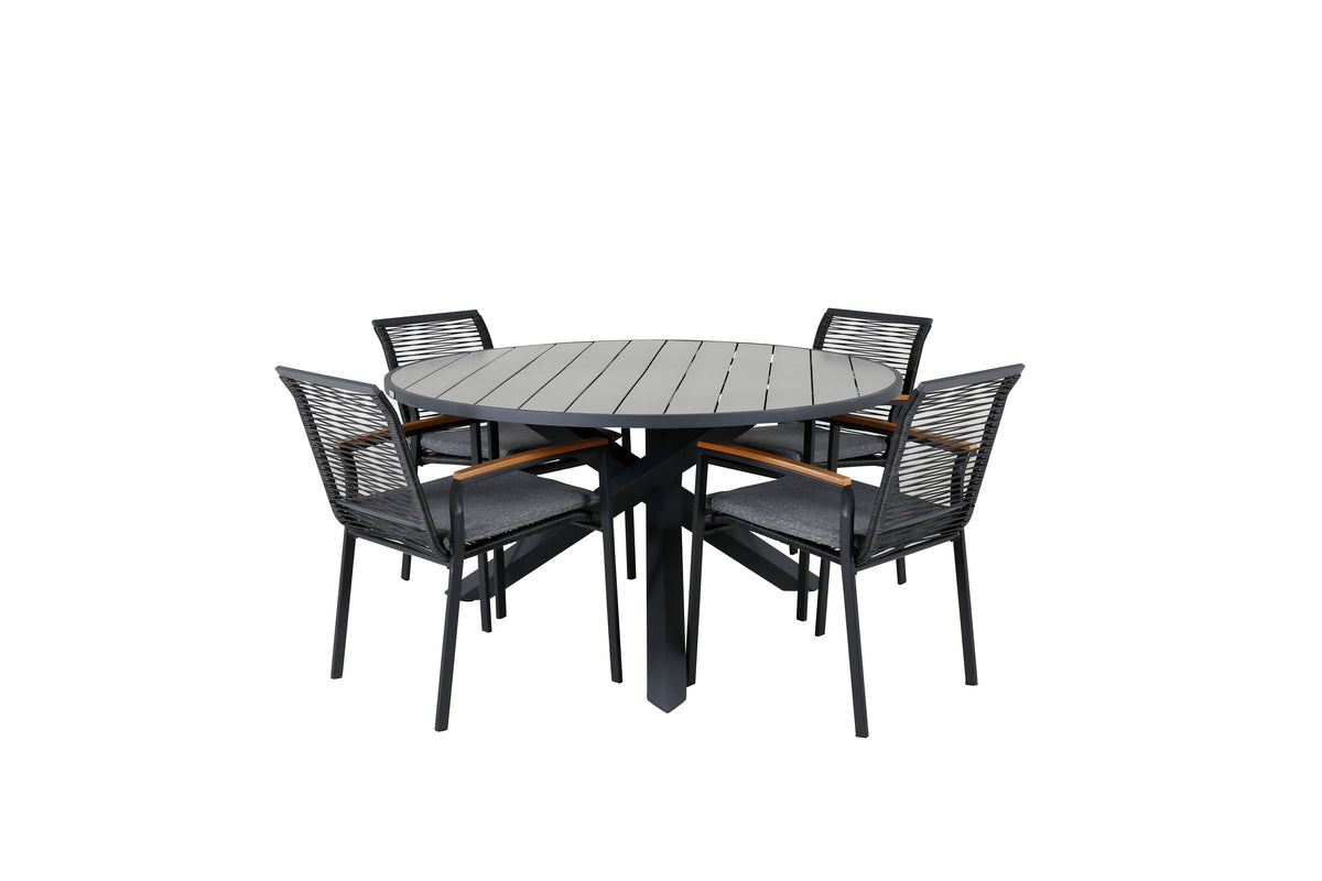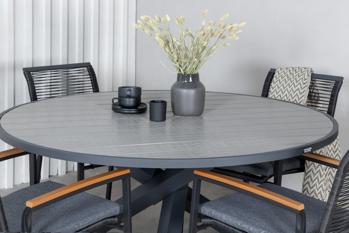 Dallas, vores populære spisestole i sort reb og dekorative armlæn i træ. Her sammen med det runde spisebord Parma. Invitér til mange sociale stunder i sommer!