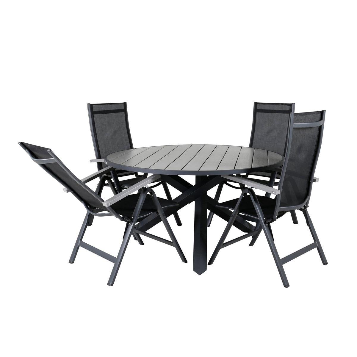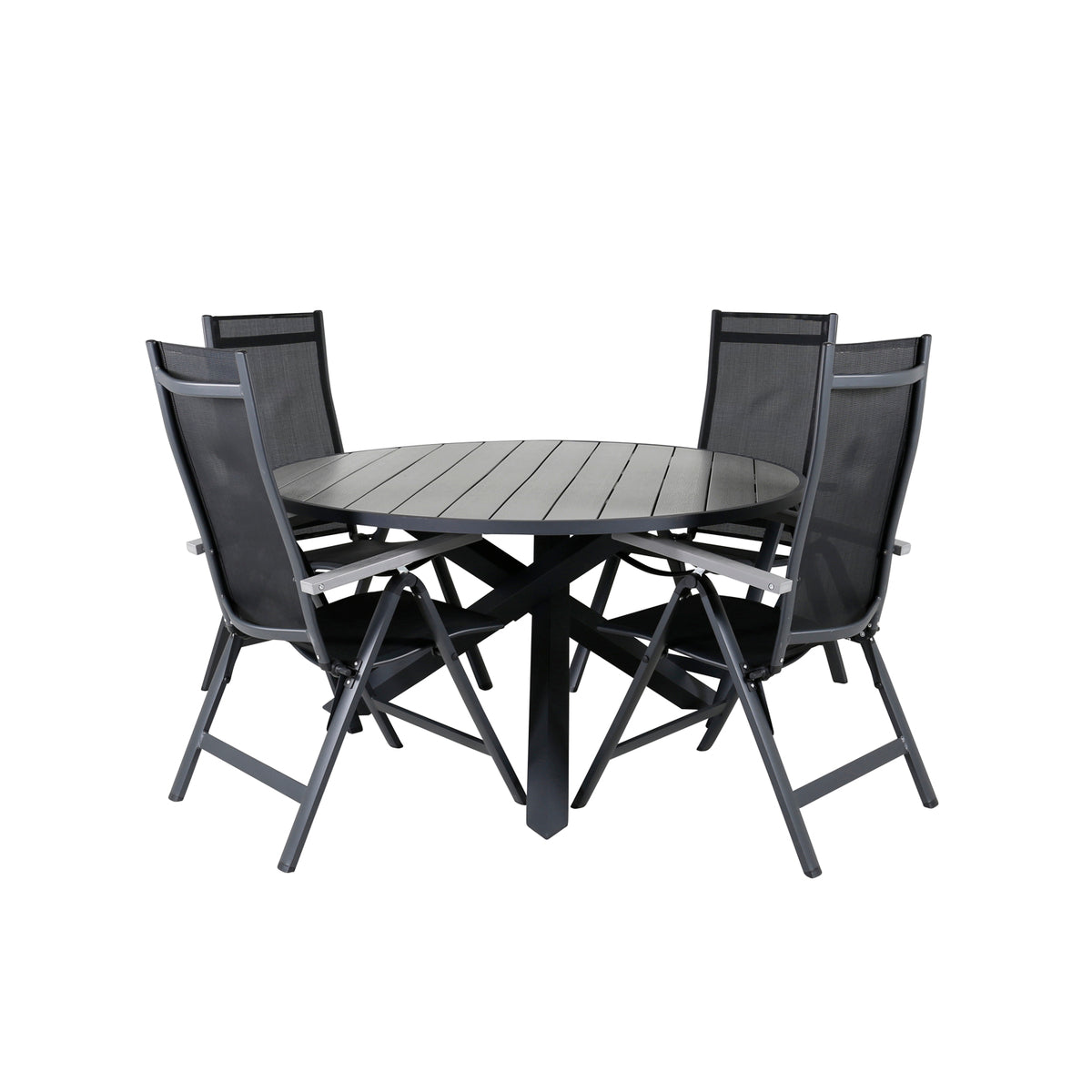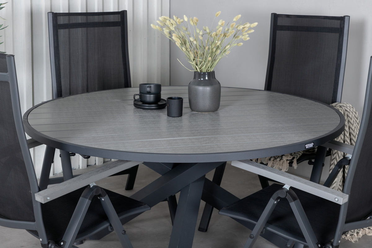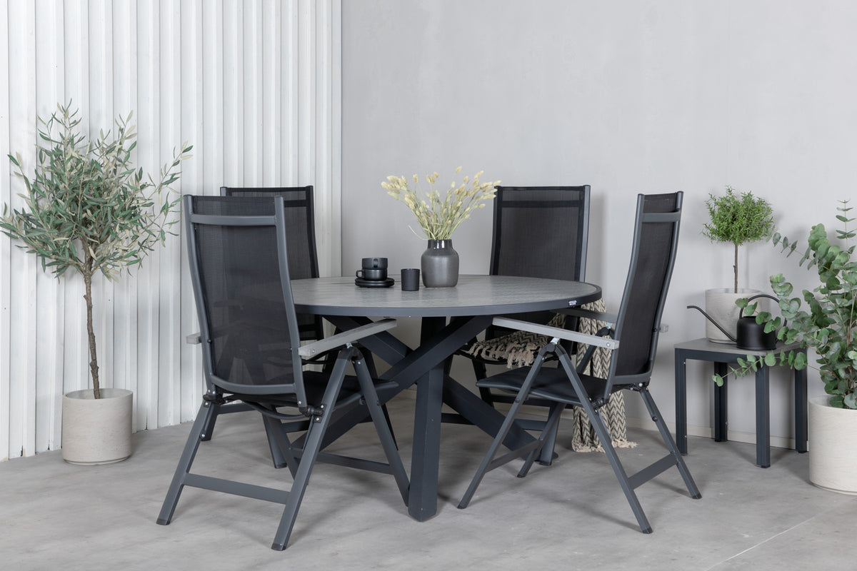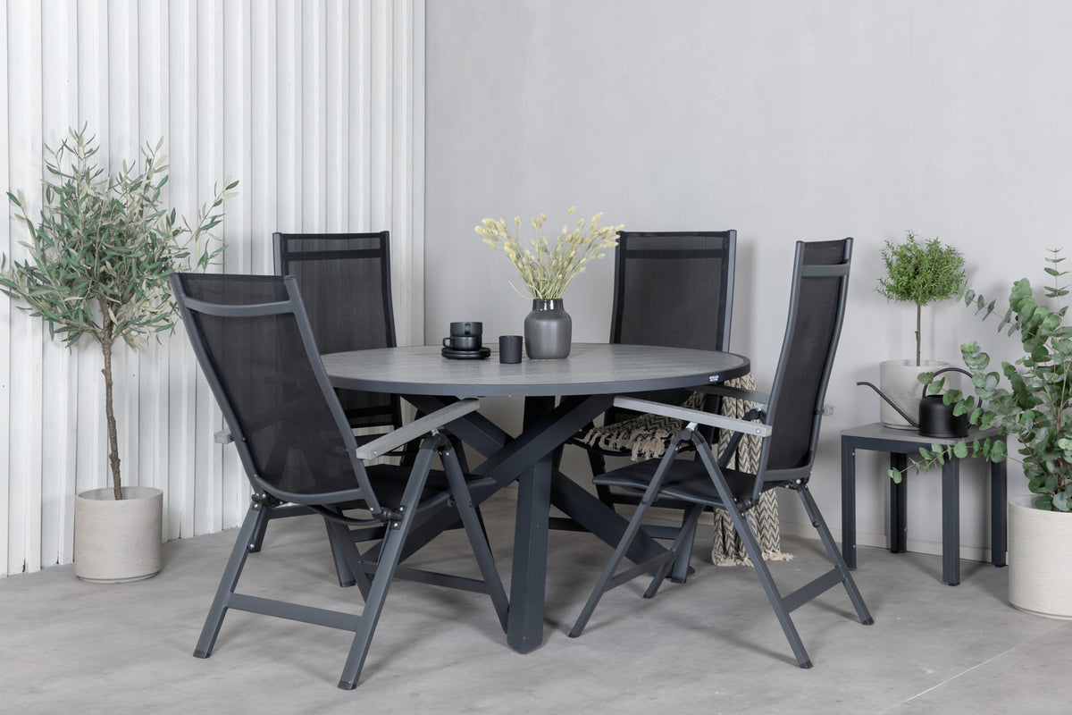 En rund spisegruppe i sort farve går aldrig af mode! Spisebord Parma med robust krydsstel og grå bordplade matcher perfekt spisestolene fra serien Albany. Stolene er sammenklappelige og rummelige - juster ryglænet for optimal komfort og nyd lange middage i sommer!