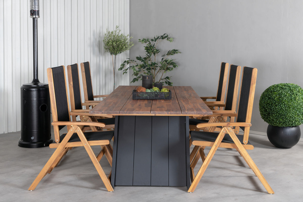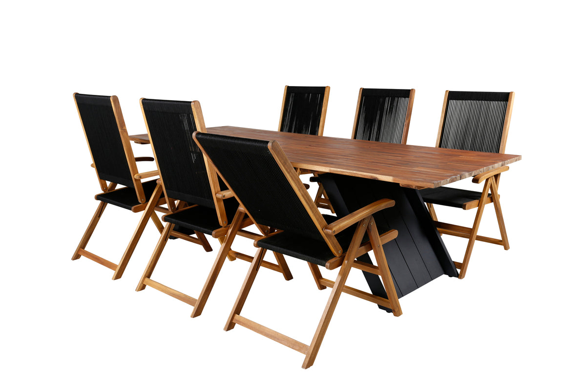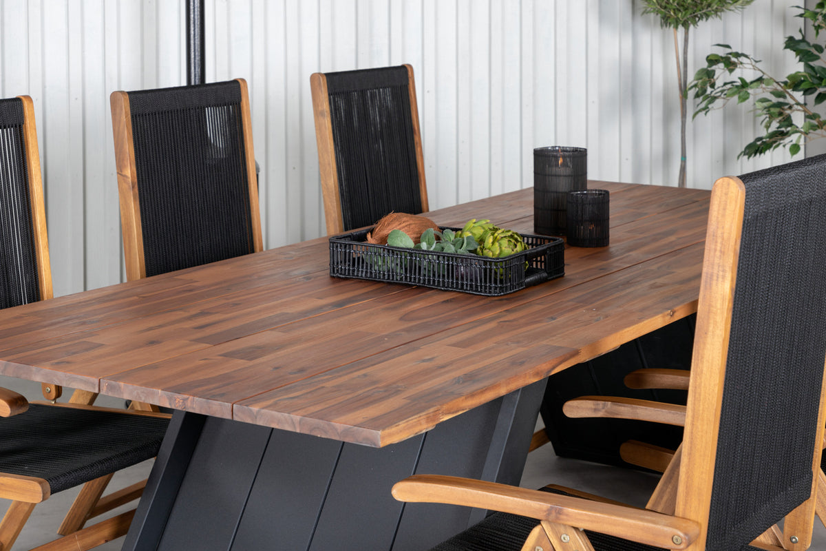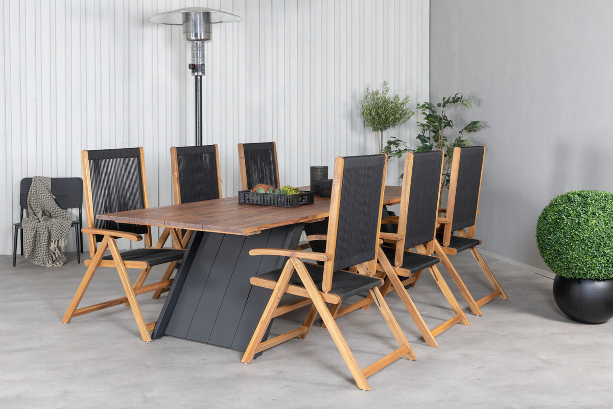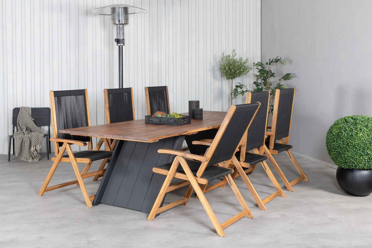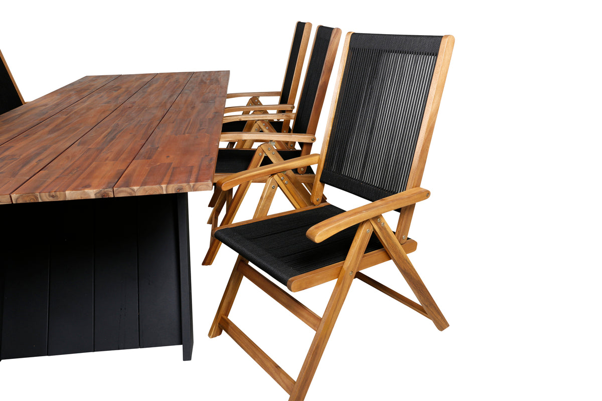 Indret terrassen storslået med dette lækre spisesæt i moderne design! Med spisebord Doory i kombination med sammenklappelige stole fra Little John tilbydes du et stilfuldt, smart og slidstærkt spisesæt - perfekt til alle de dejlige udendørs aftener i sommer sammen med venner og familie!