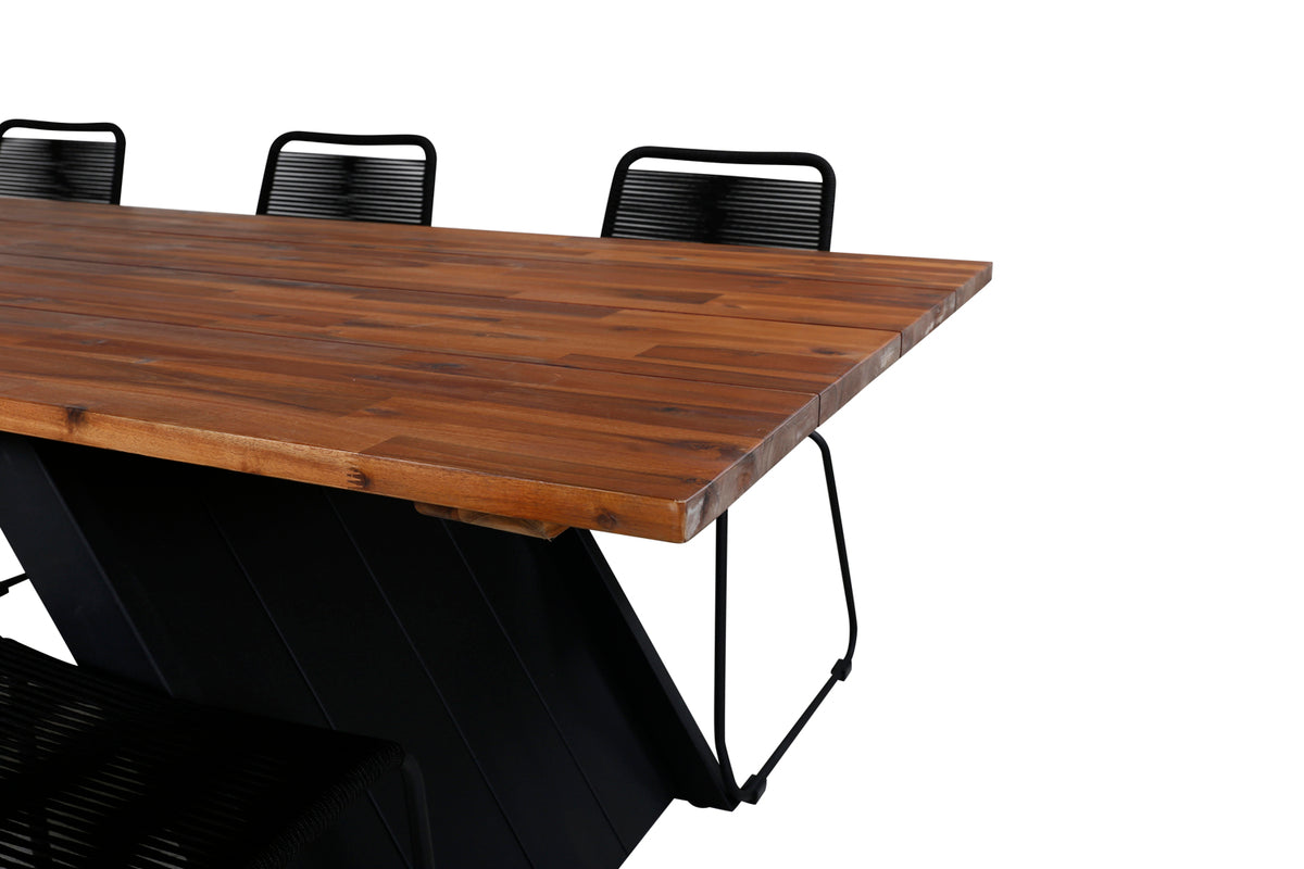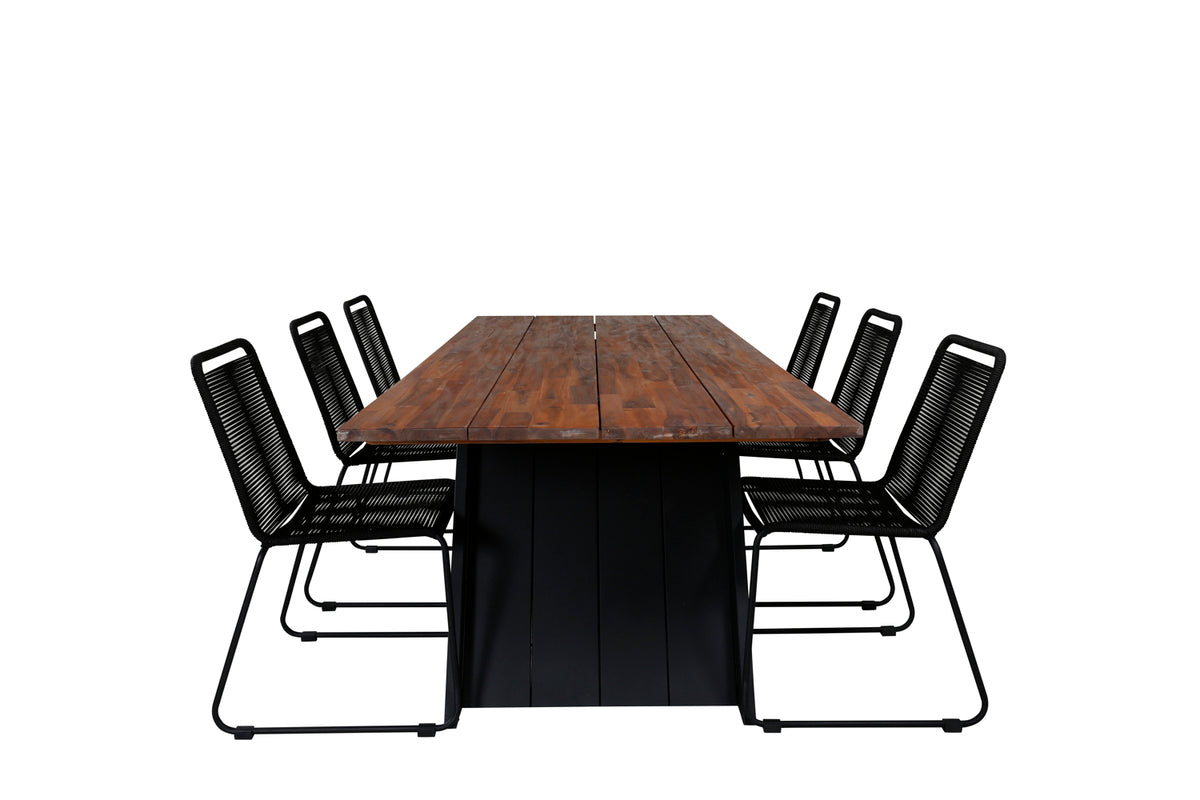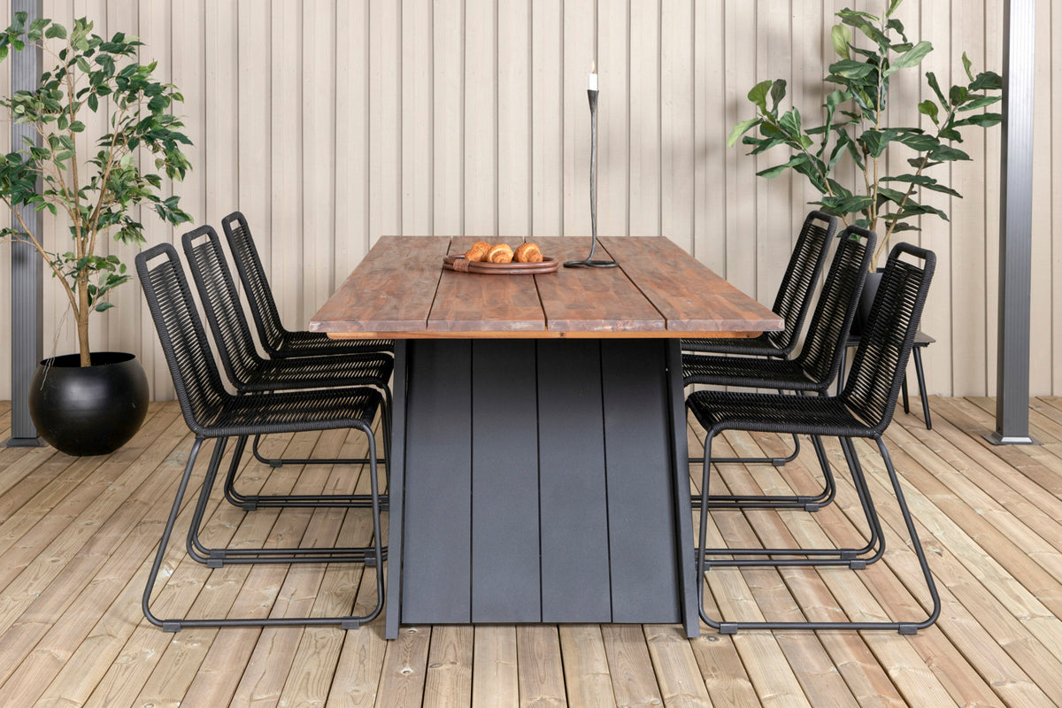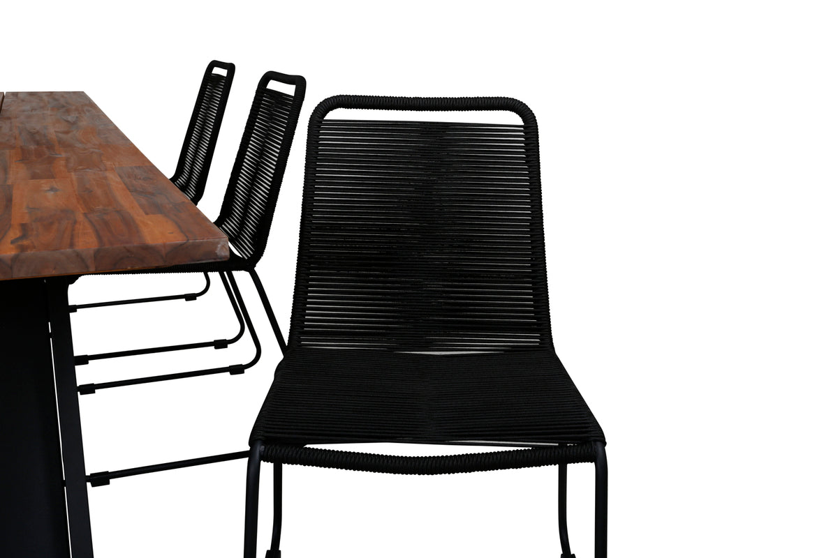 Lindos, vores populære spisestole i sort reb og stilrent smalle ben. Her sammen med det smagfulde spisebord Doory med dekorativt udsvunget stel og bordplade i træ. En rektangulær spisegruppe er perfekt til dig, der ønsker at kunne udvide middagsinvitationerne - så inviter familie og venner hjem og nyd herlige måltider sammen!