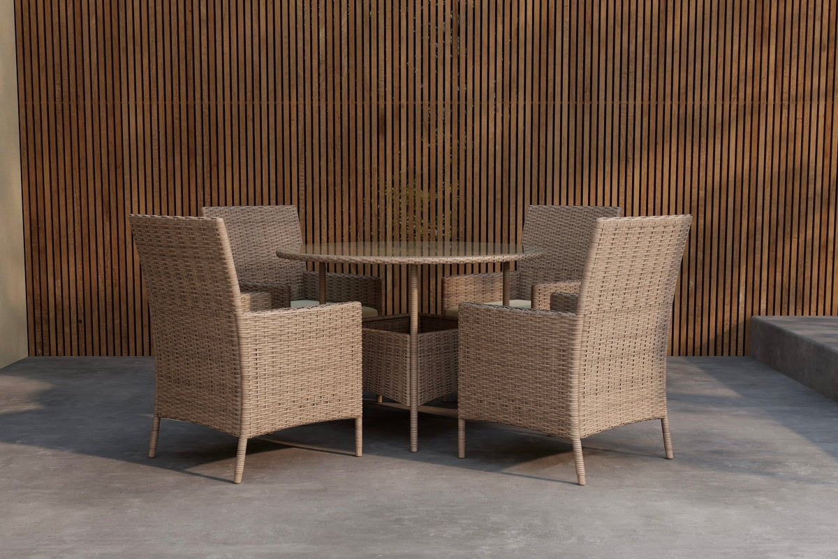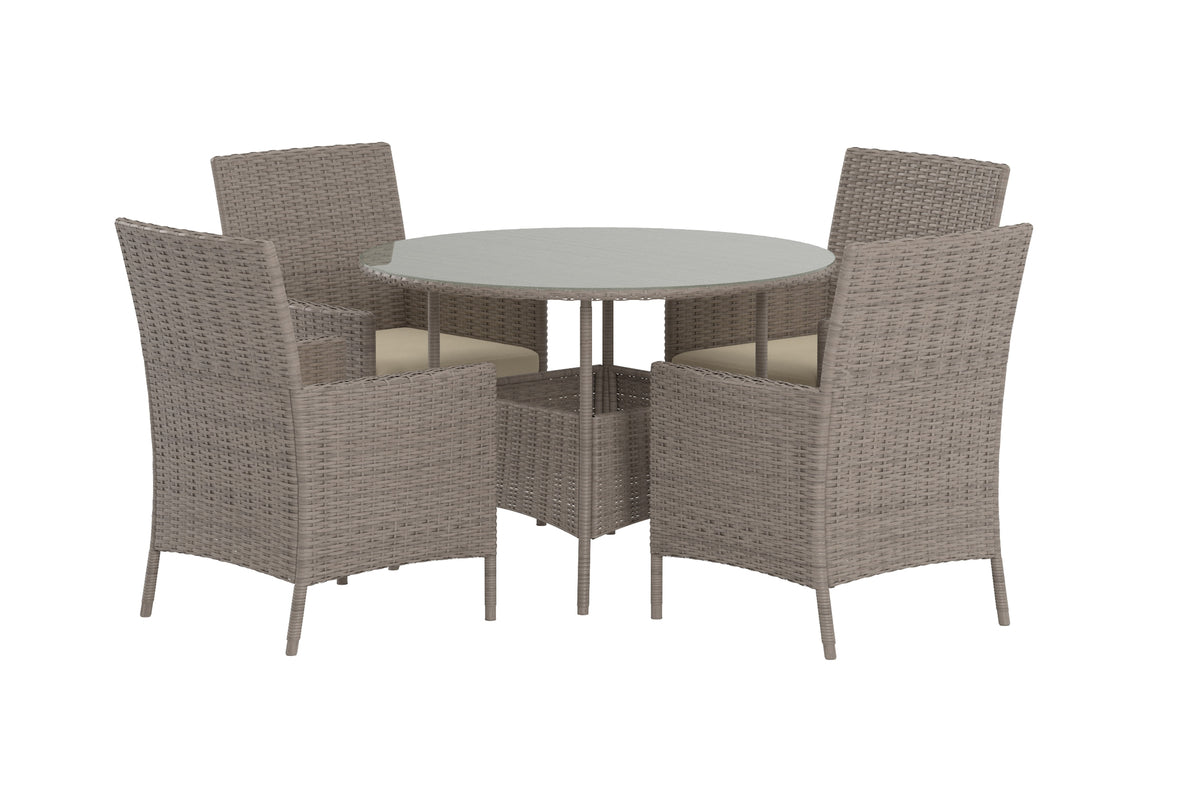 Lefkas spisegruppe er en tidløs og indbydende møbelgruppe i brunt wicker, der skaber en varm og naturlig følelse på terrassen. Gruppen består af et rundt bord med glasplade og fire komfortable stole i klassisk design. Den flettede wickerstil giver et charmerende og hyggeligt udtryk, samtidig med at den er nem at matche med andre havemøbler. Lefkas spisegruppe er det perfekte valg for dig, der vil have et praktisk og stilfuldt sted at samles til måltider og samvær udendørs.