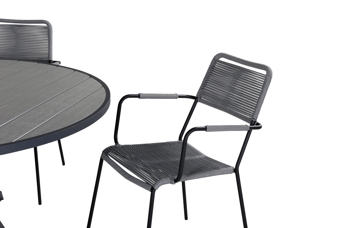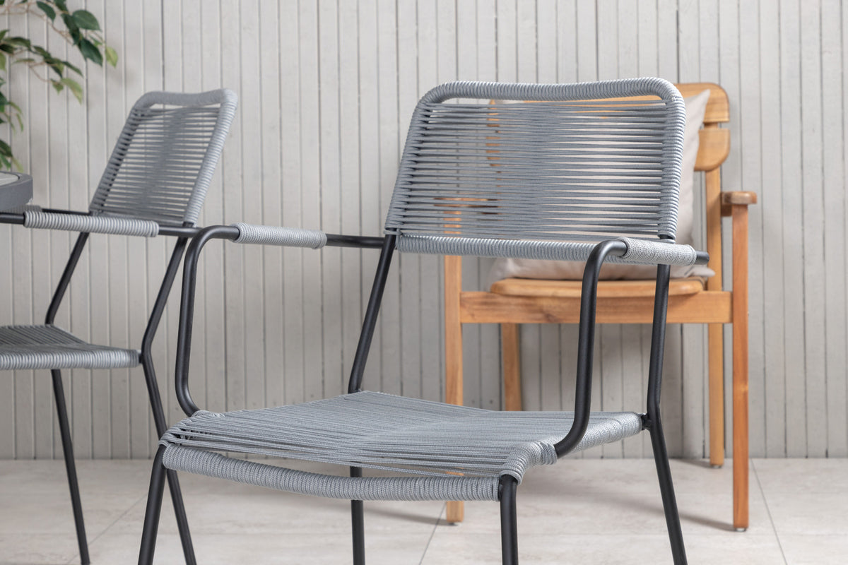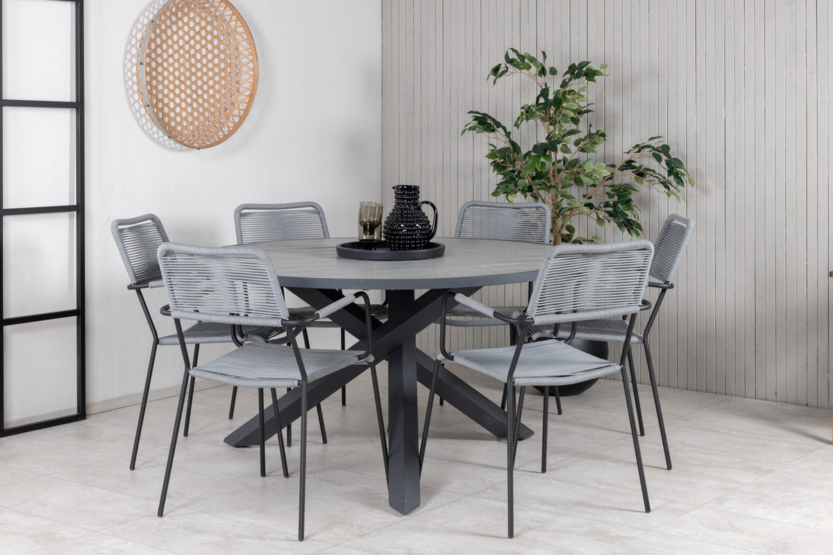 Lindos, vores populære spisestole i gråt reb og stilrent smalle ben. Her sammen med det smagfulde spisebord Parma med dekorative krydsben. En rund spisegruppe er perfekt til dig, der vil skabe en hyggelig og familiær stemning i din udestue eller på terrassen - så inviter familie og venner hjem og nyd dejlige måltider sammen!