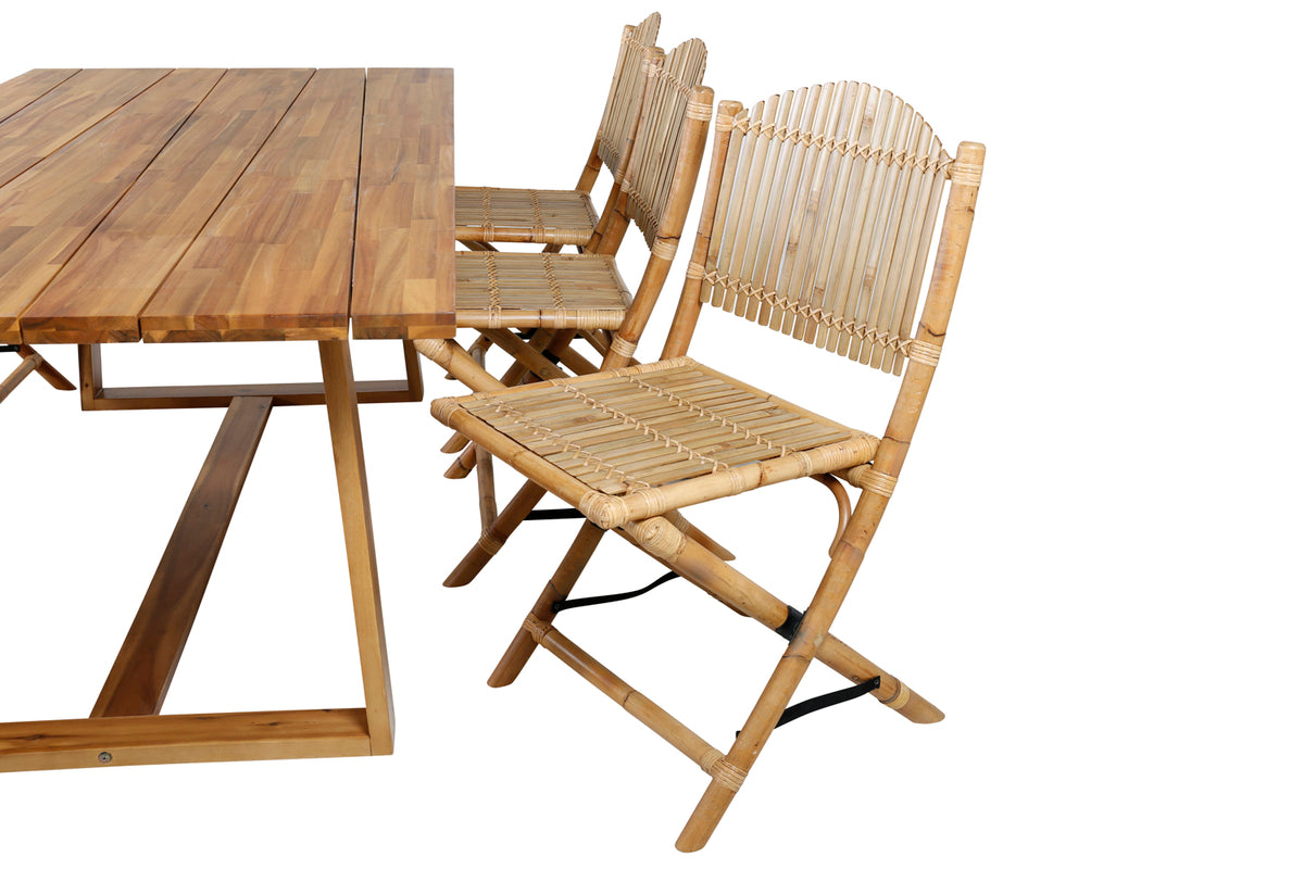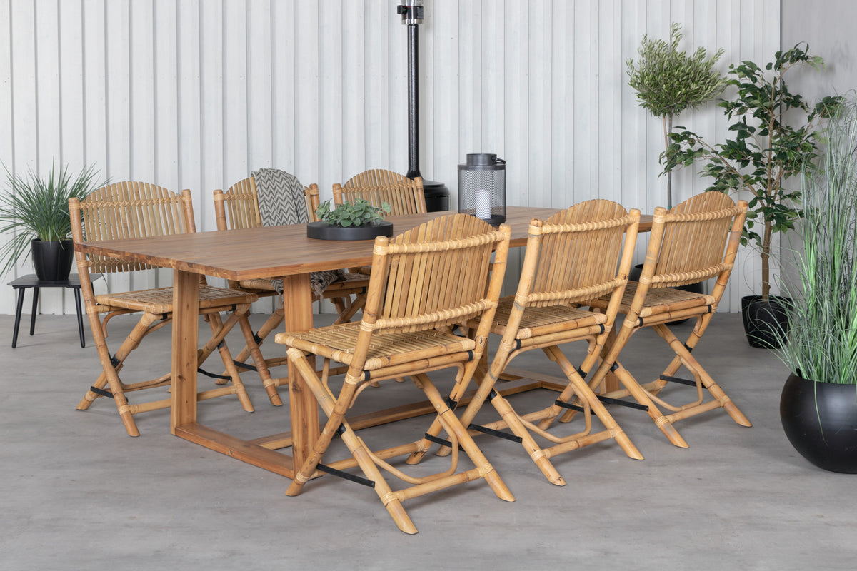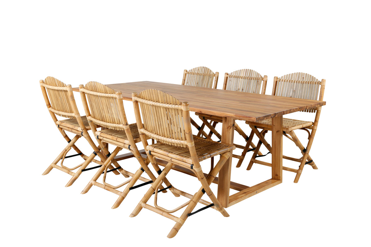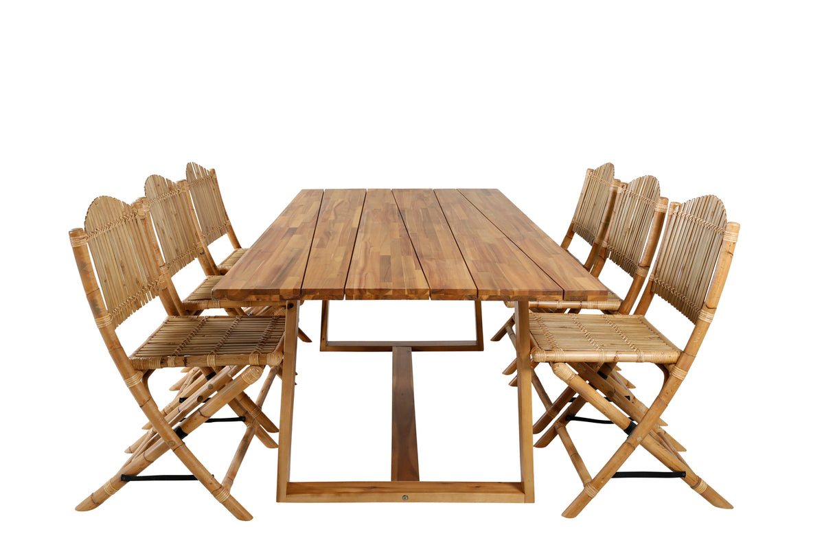 Før den herlige lounge-følelse ind i udestuen eller til altanen med denne moderne spisegruppe i bambus og træ! Spisebord Plankton i klassisk design kombineres med tropiske spisebordsstole fra serien Cane. Lad denne iøjnefaldende spisegruppe pryde din terrasse og forlænge sommerens middagsstunder!