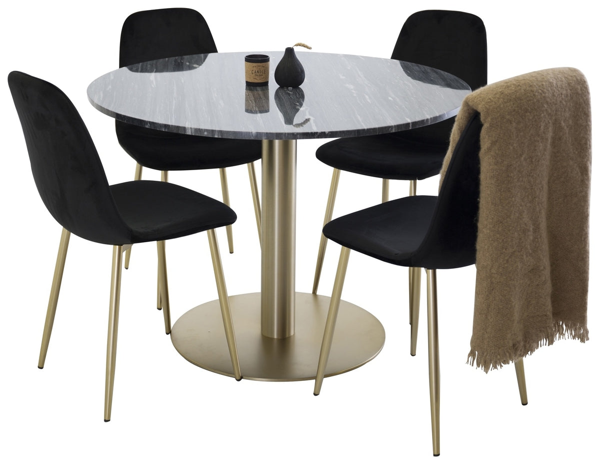 Estelle, et smukt marmorbord, der her kombineres med stilfulde spisestole fra Polar. Bordets understel og stolens ben matcher på en lækker måde. Her får du en spisegruppe, der giver et luksuriøst indtryk!