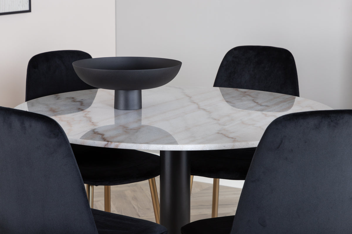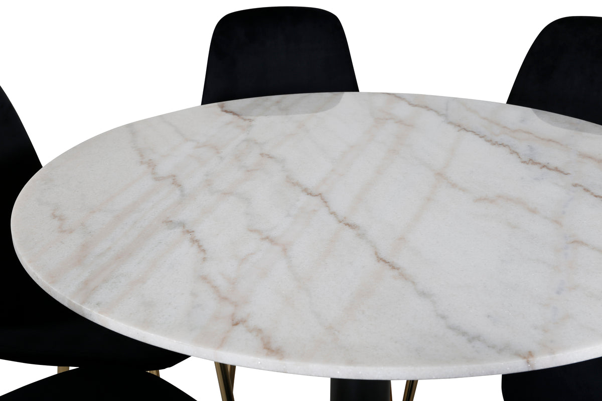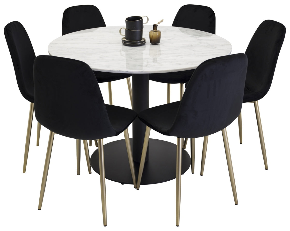 Runde spisegrupper har en tendens til at skabe en dejlig stemning omkring bordet! Her kombineres vores moderne spisebord Estelle i smuk marmor med vores luksuriøse stole i Polar.