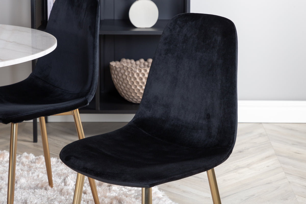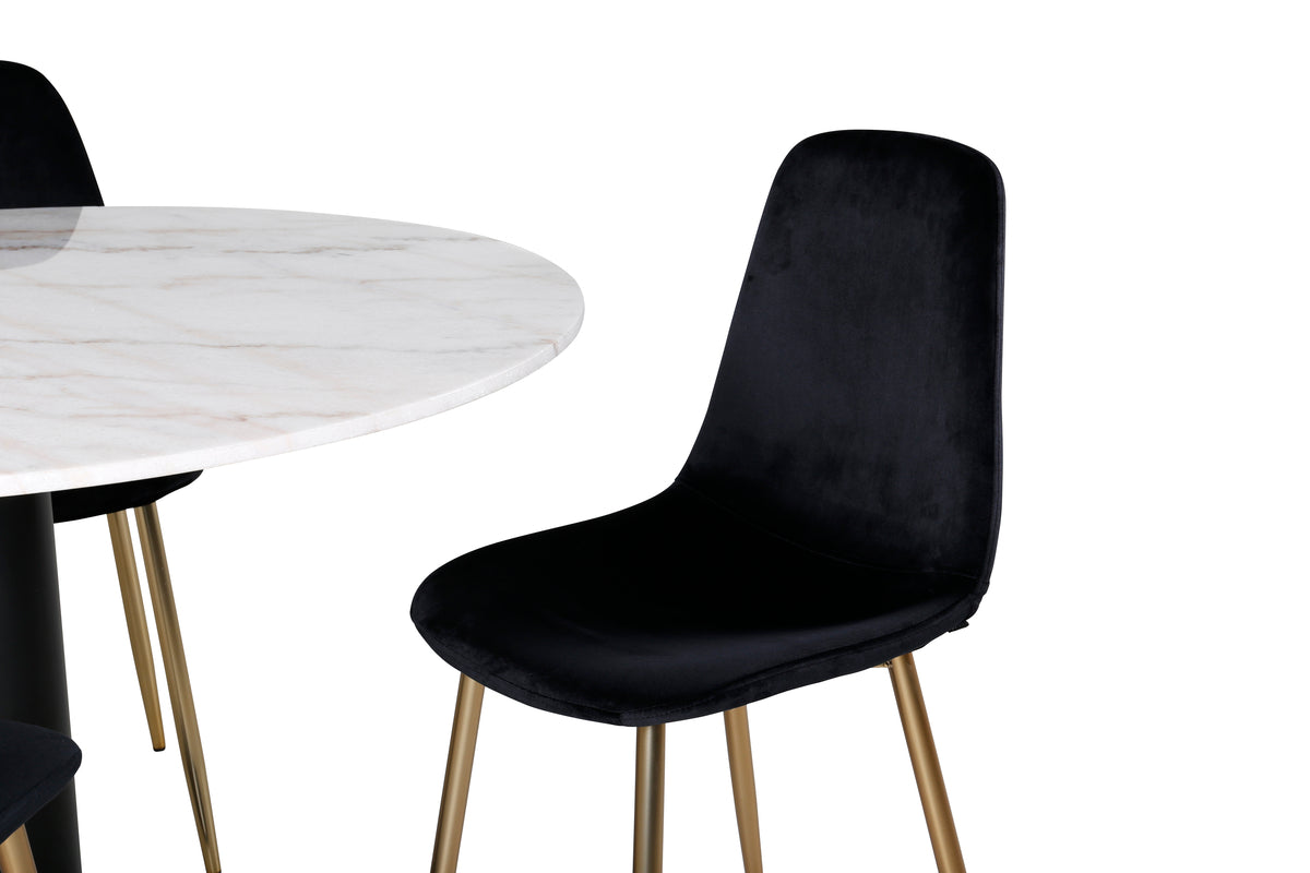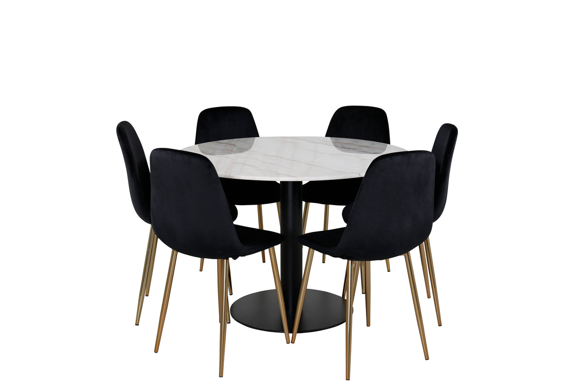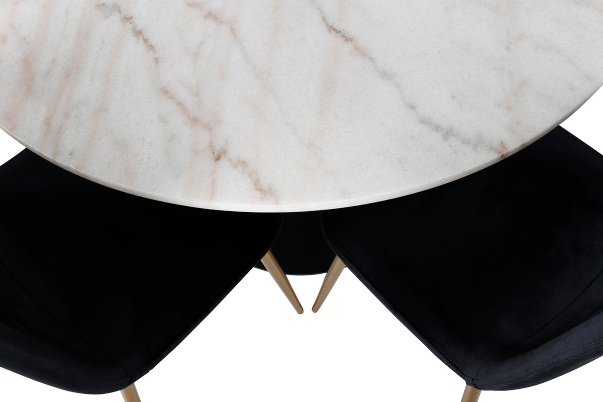 Runde spisegrupper har en tendens til at skabe en dejlig stemning omkring bordet! Her kombineres vores moderne spisebord Estelle i smuk marmor med vores luksuriøse stole i Polar.