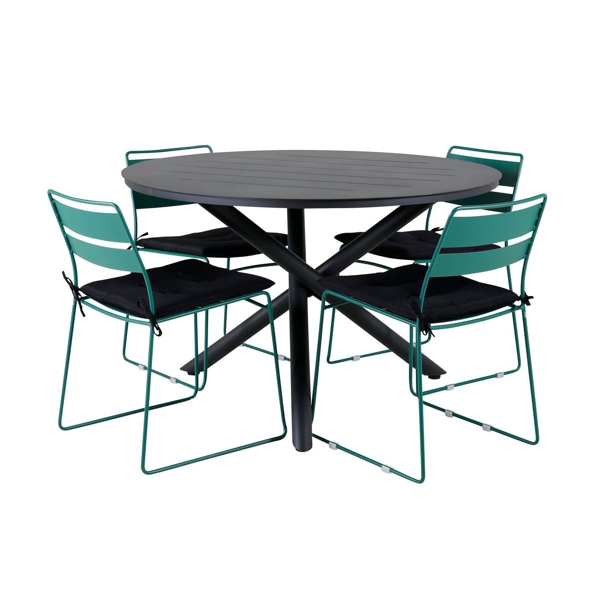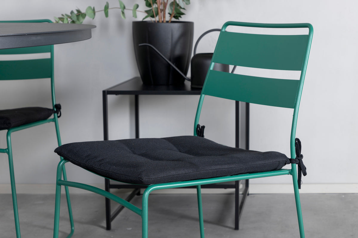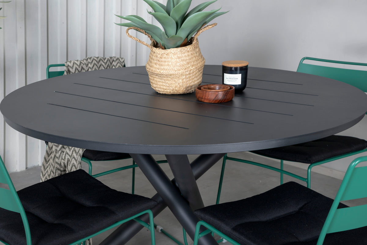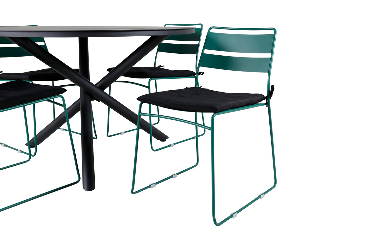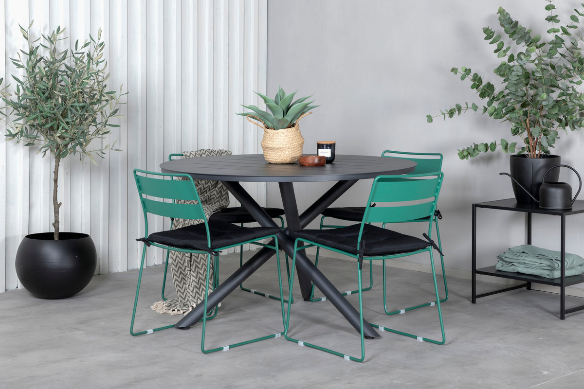 Her har vi en spisegruppe, der giver et personligt førstehåndsindtryk med sit farverige og iøjnefaldende design! Lina er en stilren stol i lækker grøn farve, som takket være sit minimalistiske design skaber en luftig atmosfære på terrassen. Her sammen med vores runde spisebord Alma i sort farve. Bordet er fremstillet i aluminium, hvilket gør det nemt at flytte rundt efter behov. Forlæng den sommerlige frokost i en trendy spisegruppe!