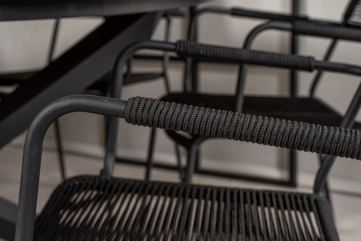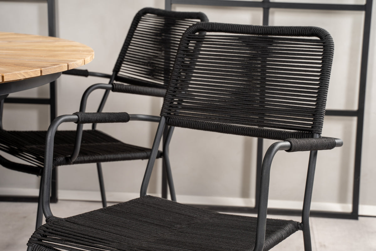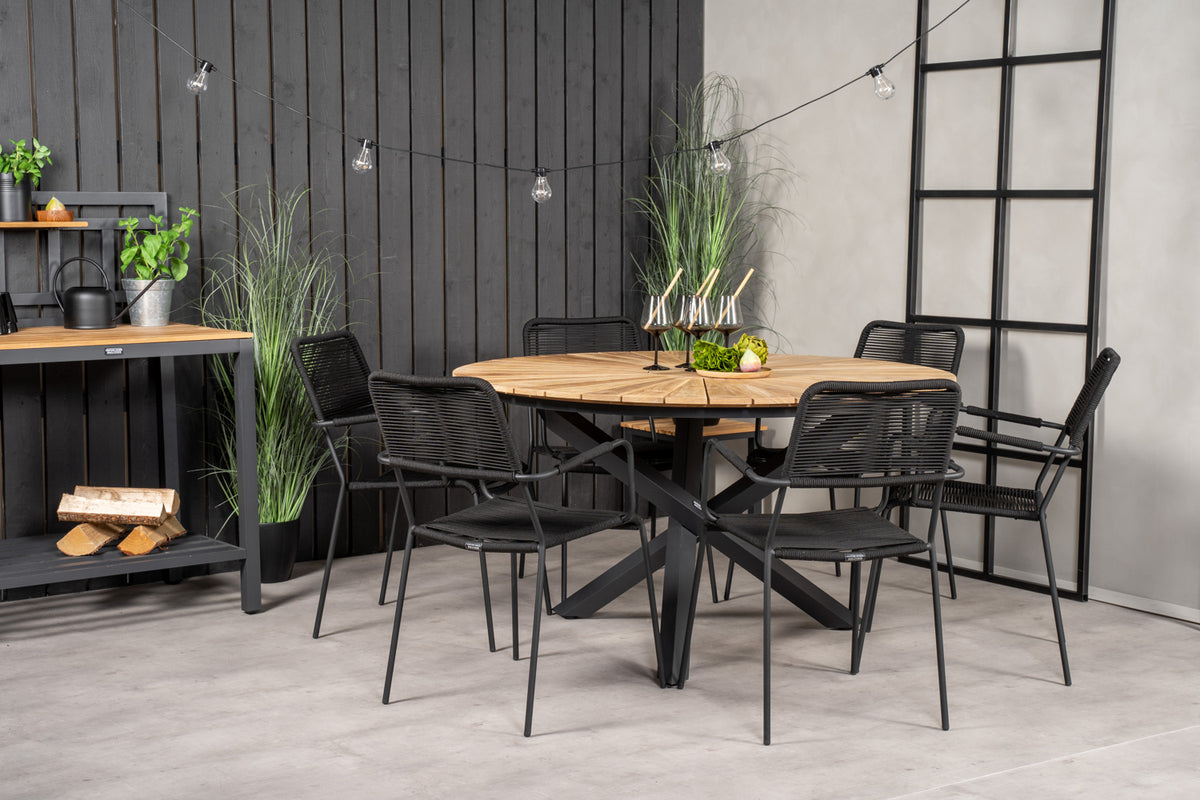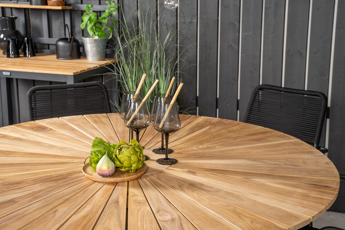Mexico spisebord sammen med sorte stole fra serien Lindos – et rundt spisebordssæt, som med sit smagfulde design falder i manges smag. Bordpladen er fremstillet i teak, og stolene er fremstillet i sort aluminiumskonstruktion med et sæde i sort vævet reb. Møblér og gør dig klar til udesæsonen – på bedste vis!